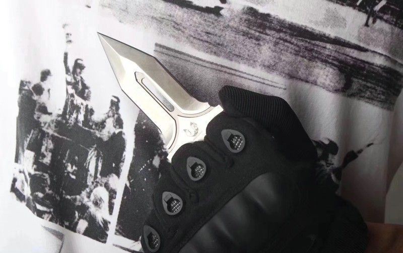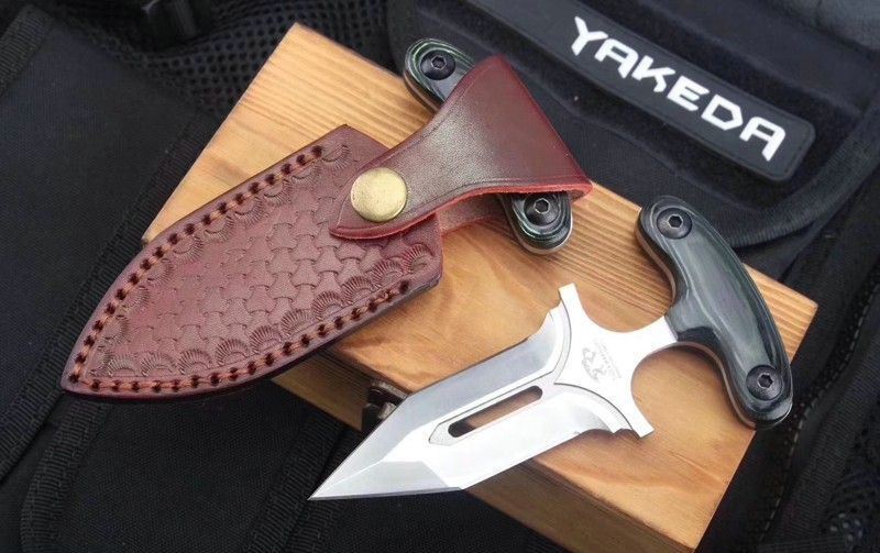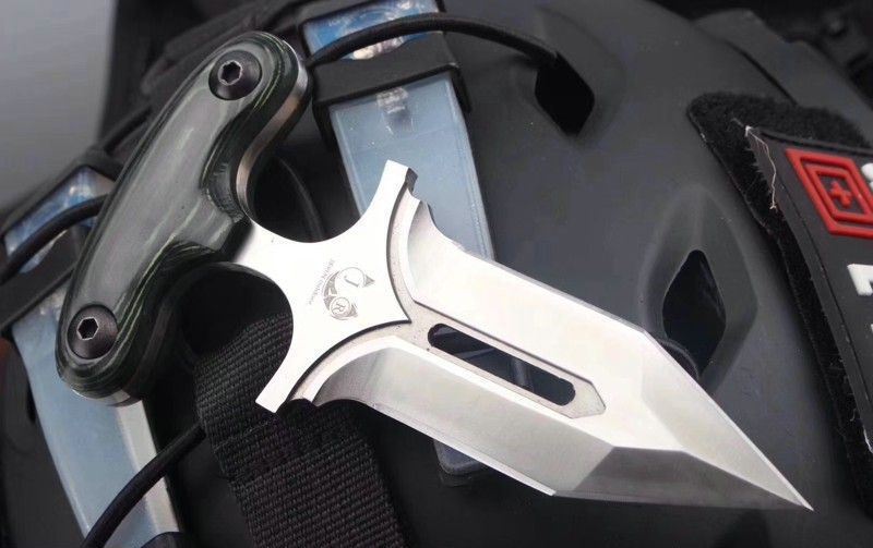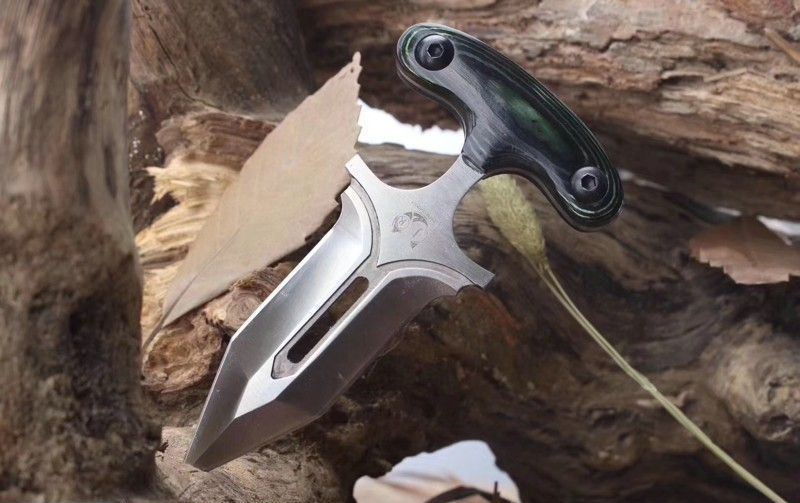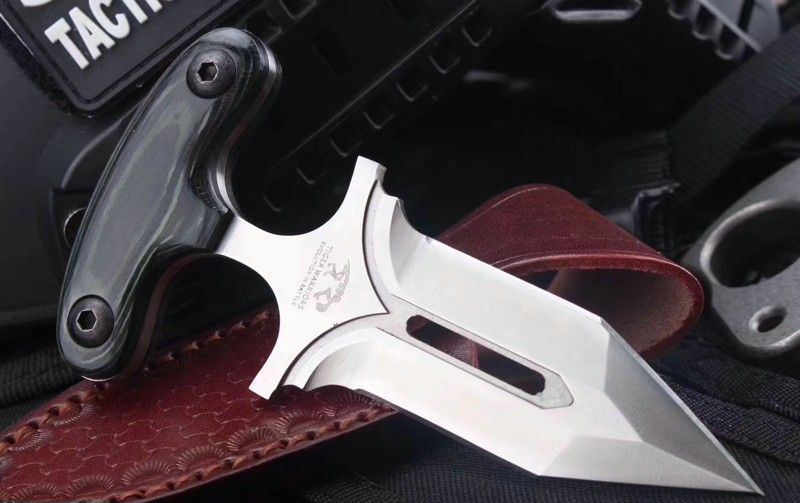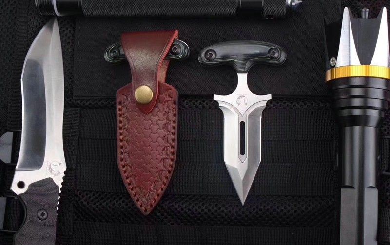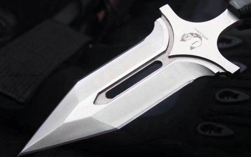 守护者手刺 产品全长:13.2CM 产品刃长:10CM 产品柄长:3.2CM 最大宽度:4.5CM 产品材质:进口D2钢材 产品硬度:61HRC 表面处理:砂光 柄部材质:米卡塔 含鞘总重:145g 配件:牛皮扎花皮套、精品木盒 其他:全手工打磨、线切割、手工二次开刃制作