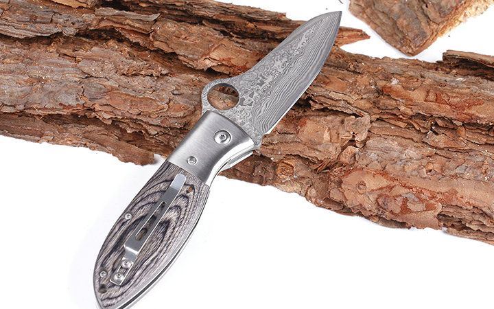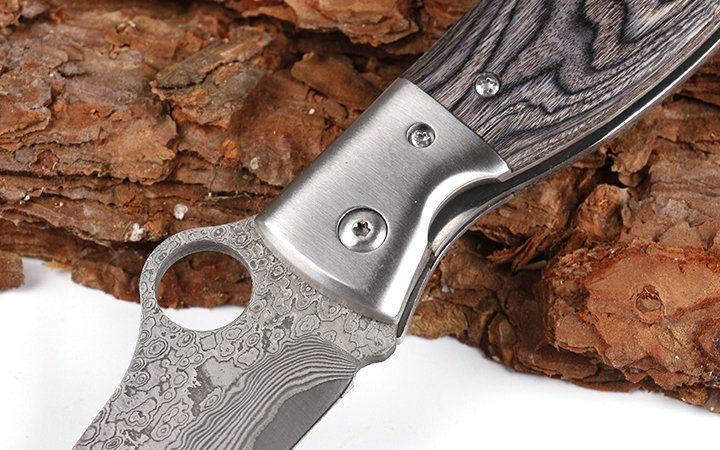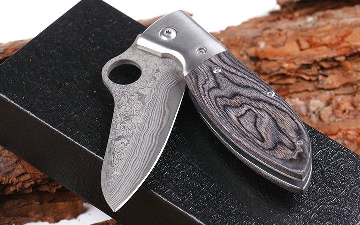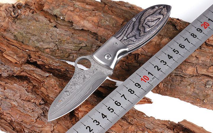 小肥腿大马士革折刀 全 长:18.3cm 刃 长:7.5cm 柄 长:12.3cm 刃 宽:3.8cm 刃 厚:2.9mm 刃 材:进口VG10大马士革,花纹处处可见,硬度可以达60度以上 刀 重: 122g 重 量:200g(含包装) 硬 度:60HRC 表 面:大马士革原有花纹 柄 材:雷射彩木 锁 型:线锁 其 他:配黑色礼品盒