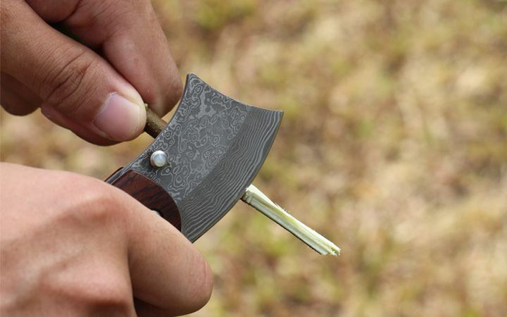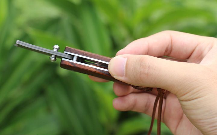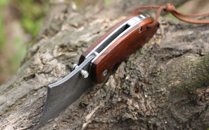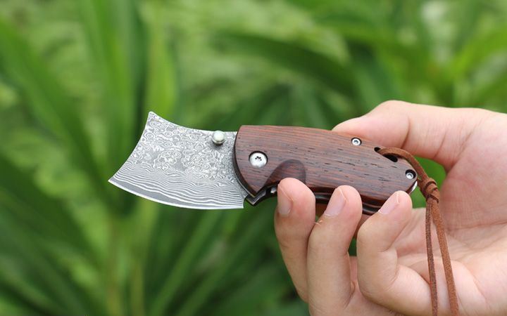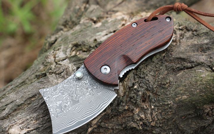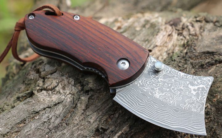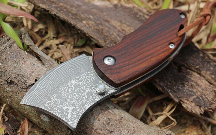小杀手大马士革折刀 品 名:自由狼 全 长:10.5cm 刃 长:5.2cm 柄 长:7.1cm 刃 宽:3.5cm 刃 厚:3.0mm 刃 材:VG10大马士革 重 量:150g(含包装) 硬 度:56-57HRC 表 面:大马士革原有纹 柄 材:天然红檀木 锁 型:侧锁 其 他:木盒出口装