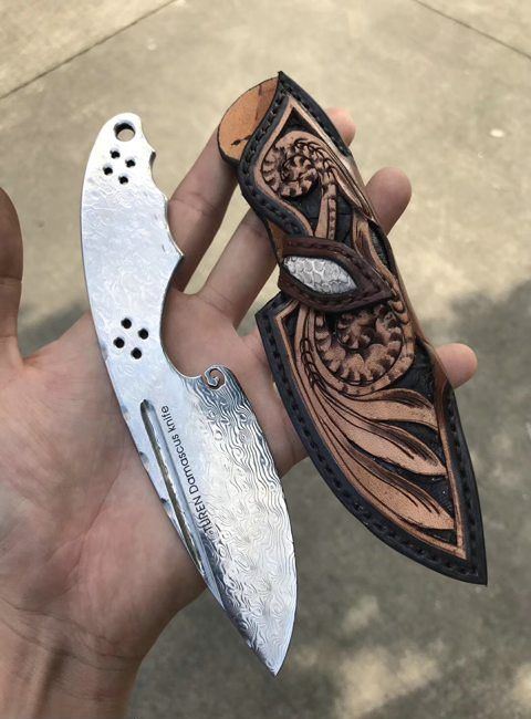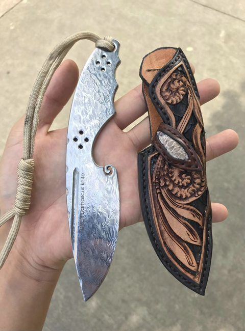 祥云大马士革直刀雕花皮纯 总长:18cm 刃长:8.5cm 刃厚:4MM 刃宽:3.6cm 钢材:无芯折叠锻造大马士革钢 硬度:60HRC,真空深了热处理 皮套:阿根廷进口植鞣皮纯收工缝线雕花,镶嵌蛇皮唐草收工雕刻
