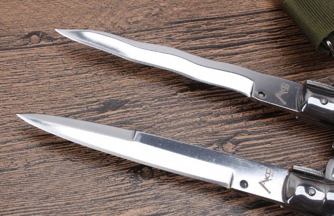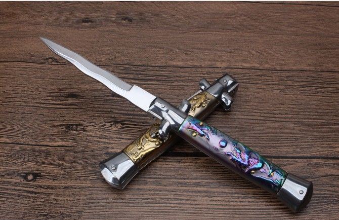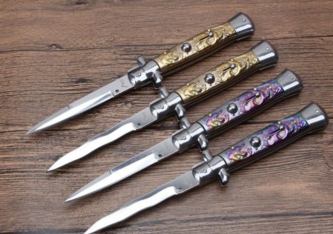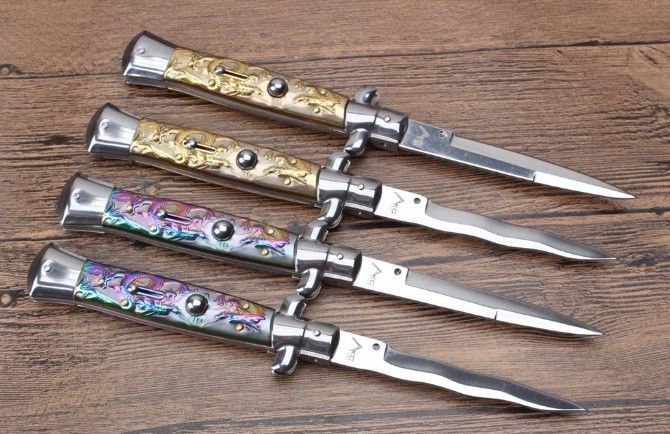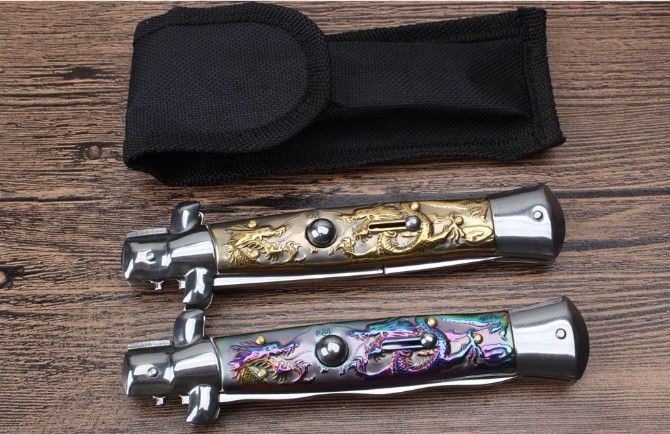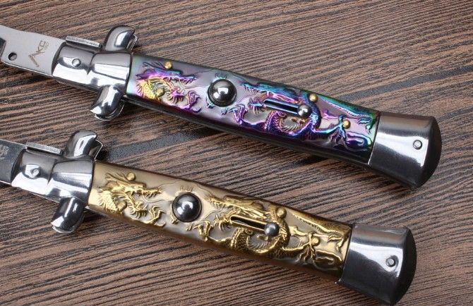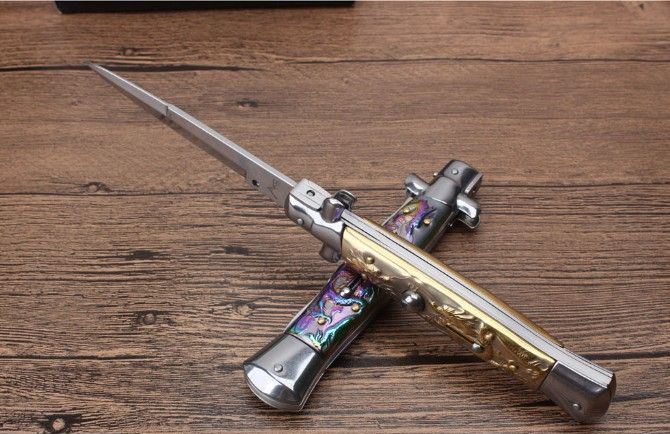 9寸AKC黑手党雕刻龙跳刀 全 长:25cm 刃 长:9cm 柄 长:14cm 刃 宽:1.3cm最宽处 刃 厚:3.0mm 刃 材:7铬17钼钒 刀 柄:镀金雕刻 表 面:镜光 开刀方式:弹簧 重 量:150克260毛重