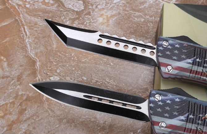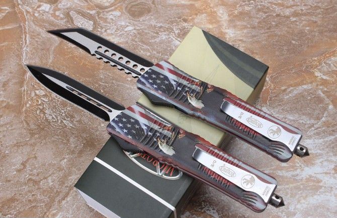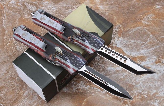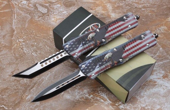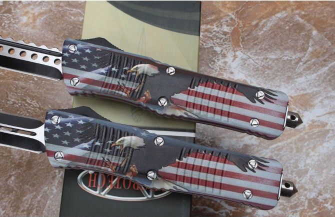 美国鹰旗地狱之犬直跳刀 全长:23.5CM 刃长:9.5CM 柄长:14.5CM 刃厚:0.3CM 硬度:56 HRC 刃材:440 表面:发黑拉丝 把手:合金热影印技术图案,耐刮 净重:275克整刀 毛重:330克含包装物 开合:双动作,直推开关,自动弹出和收回 包装:耐磨专用战术尼龙套 口袋刀夹:弹簧刀夹 玻璃敲击器:不锈钢玻璃敲击器