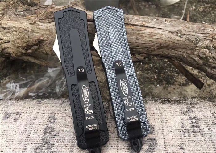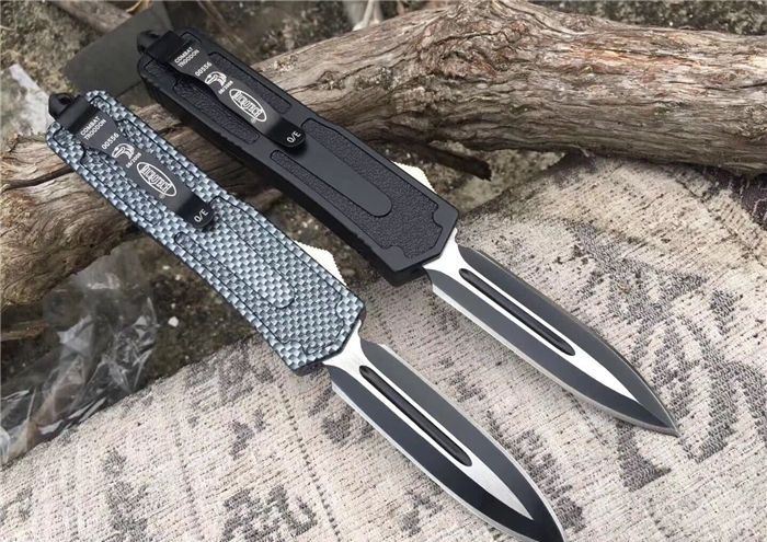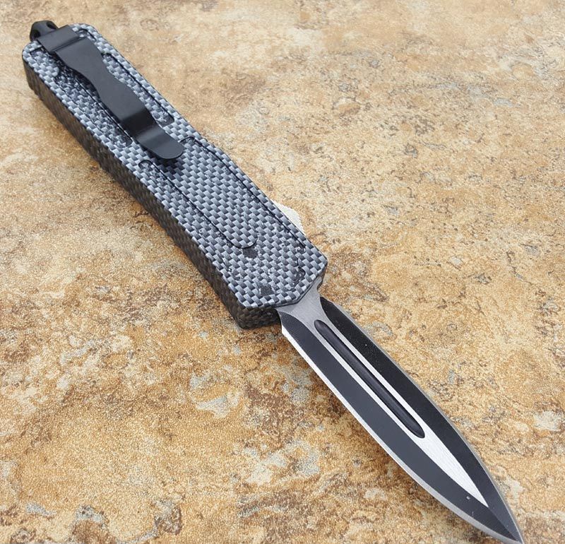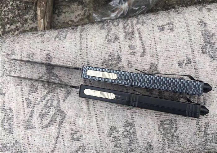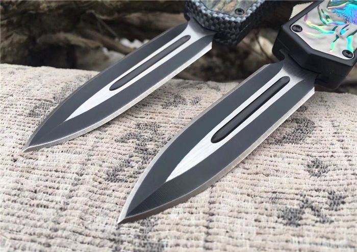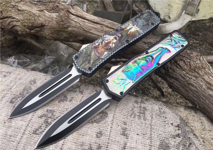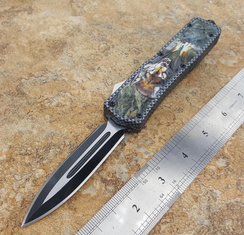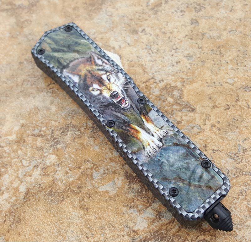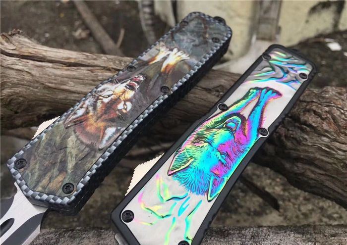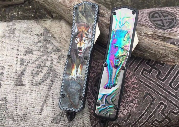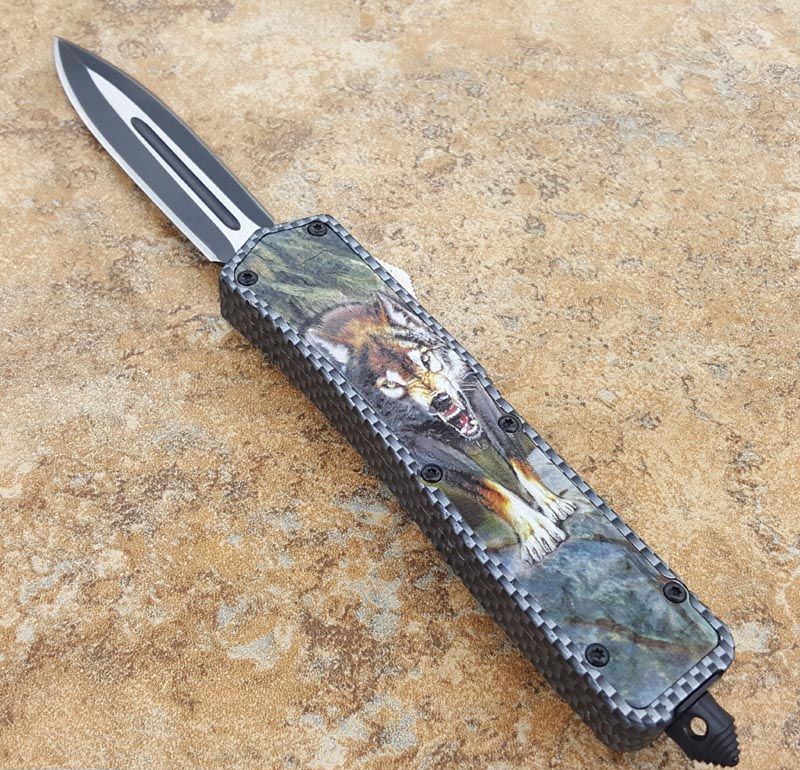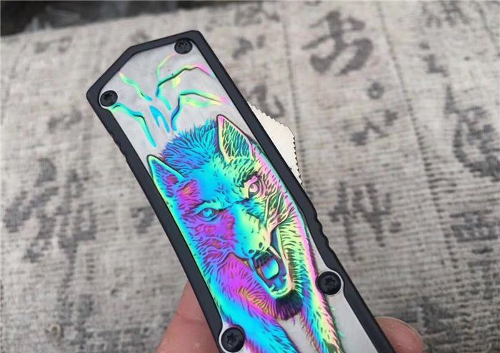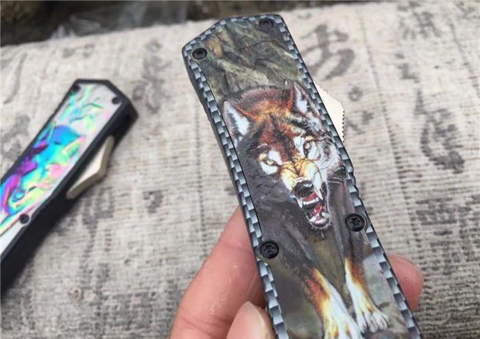 北美狼图腾直跳刀 全长:23CM 刃长:9CM 柄长:14CM 刃厚:0.3CM 硬度:56 HRC 刃材:440 表面:发黑拉丝 把手:扎花加热影印技术图案,耐刮 净重:220克整刀 毛重:330克含包装物 开合:双动作,直推开关,自动弹出和收回 包装:耐磨专用战术尼龙套 口袋刀夹:弹簧刀夹 玻璃敲击器:不锈钢玻璃敲击器