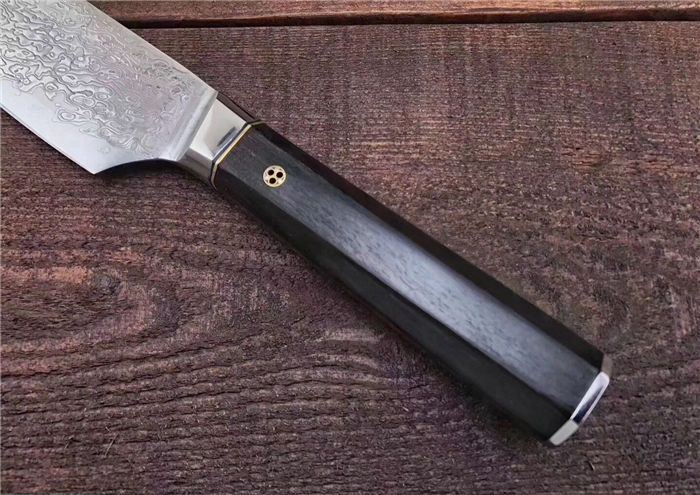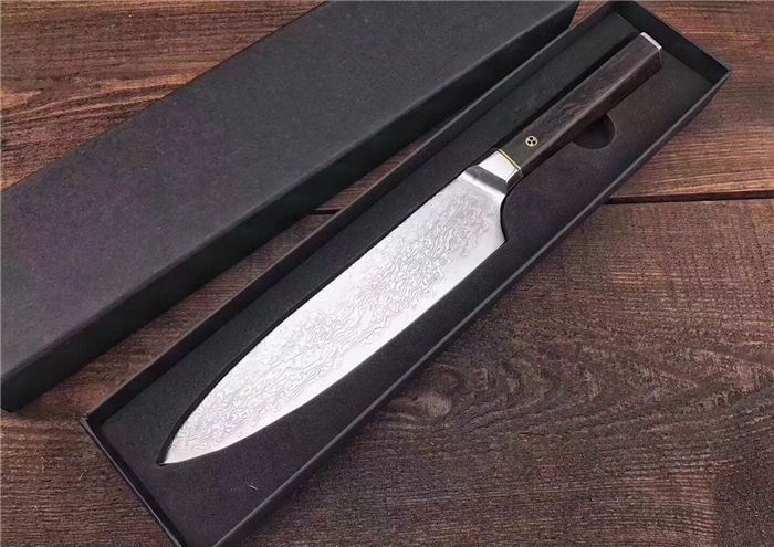 大马士革御品大师厨刀 全长:33cm 刃长:19cm 手柄长:13cm 刃最宽处:4.3cm 净重:210g 刃钢材:高硬度大马士革钢(祥云花纹) 硬度:60 手柄材料:黑檀木 包装配置:高档AV盒