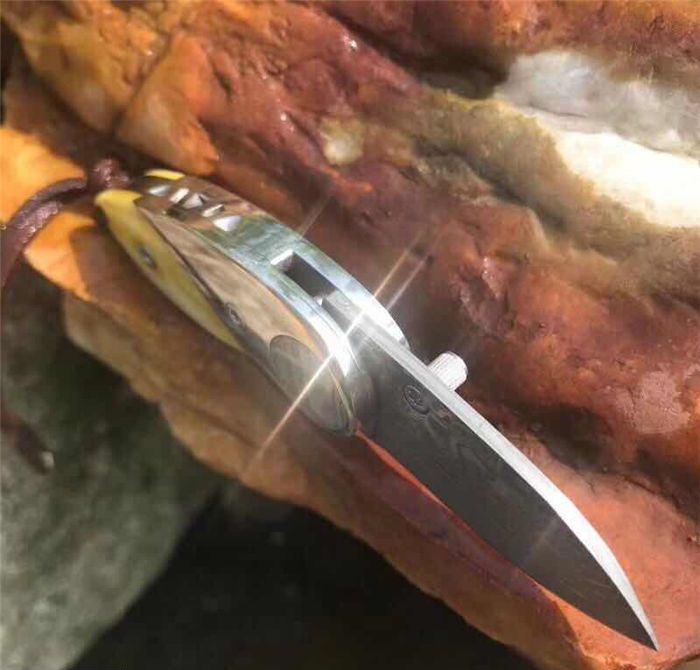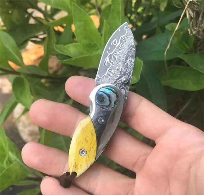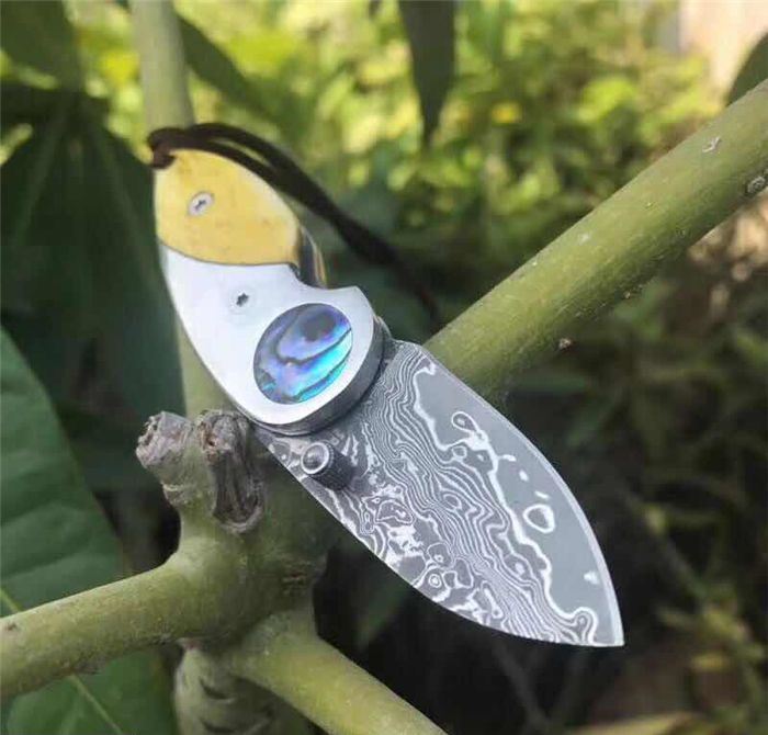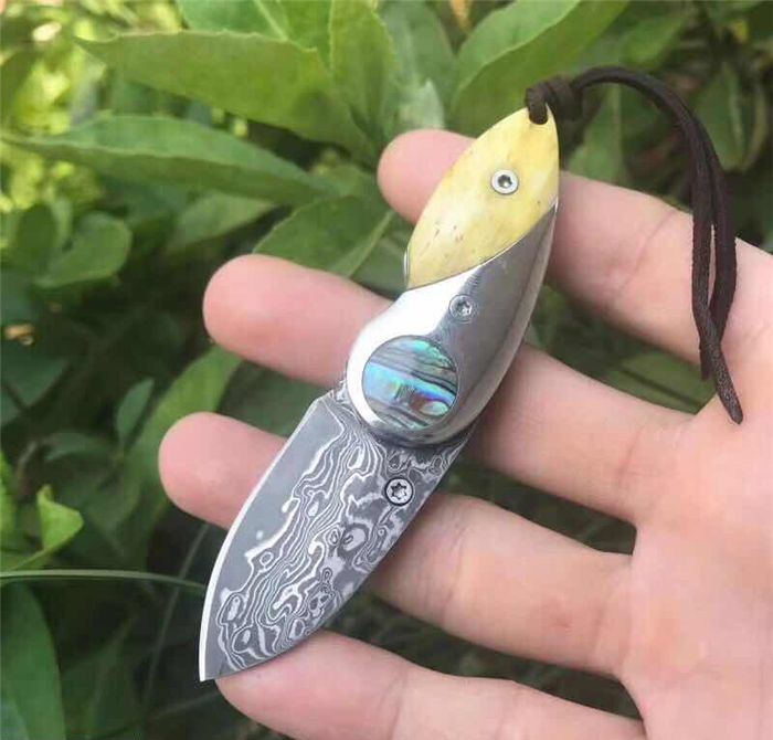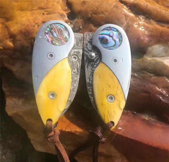 爱情鸟大马士革折刀 全 长: 9.3cm 刃 长: 4.0cm 柄 长: 5.3cm 刃 厚: 2.2mm 刃 宽: 2.0cm 刃 材: 进口Vg10大马士革钢 硬 度: 58-60HRC 重 量: 约80克(含包装) 表 面: 锻打大马士革吉祥如意花纹原色 柄 材: 染色骨片+不锈钢+鲍鱼贝壳 配 送:高档礼品盒+绒布袋+牛皮绳