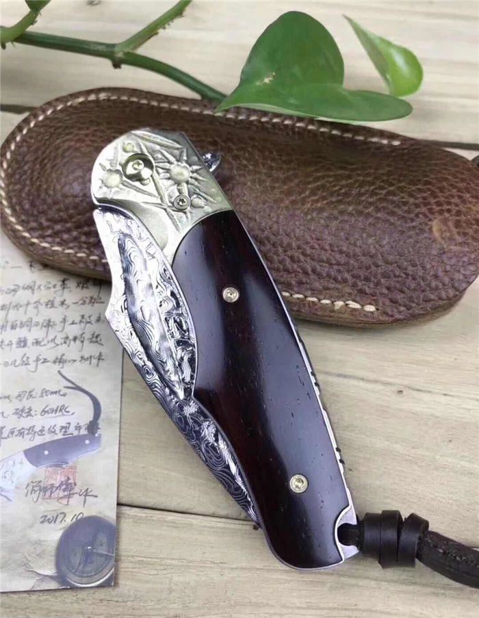 飞鲨战刀大马士革折刀 全长:18.5cm 刃长:8cm 刃厚:3.5mm 硬度:60HRC 配置头层牛皮手工缝制皮套 赠送简师傅亲笔防伪证书,复古礼盒包装.