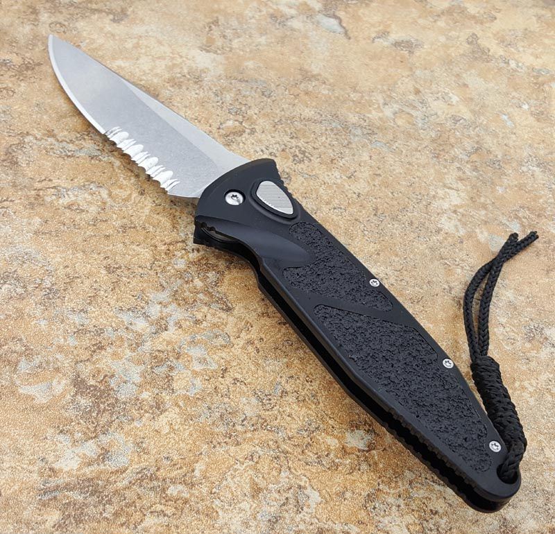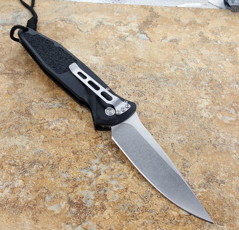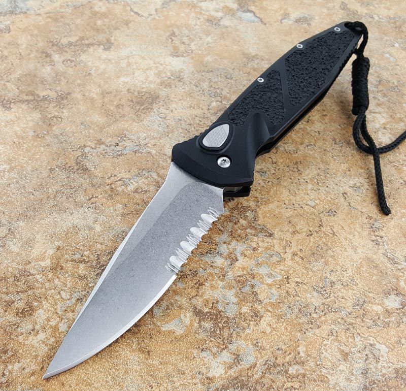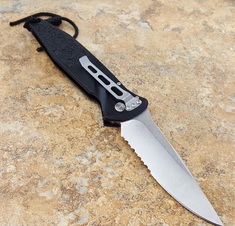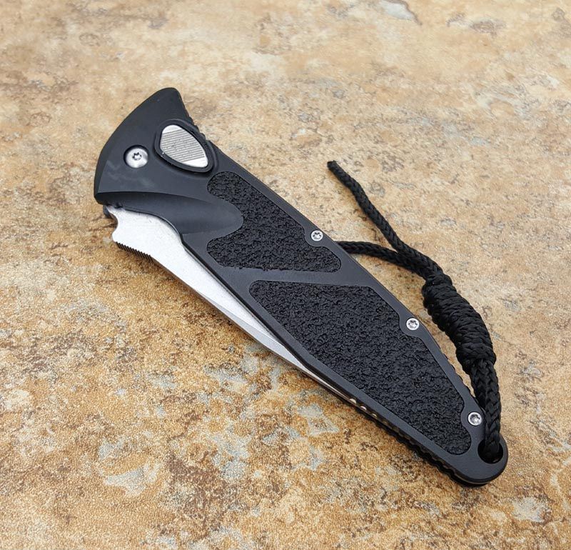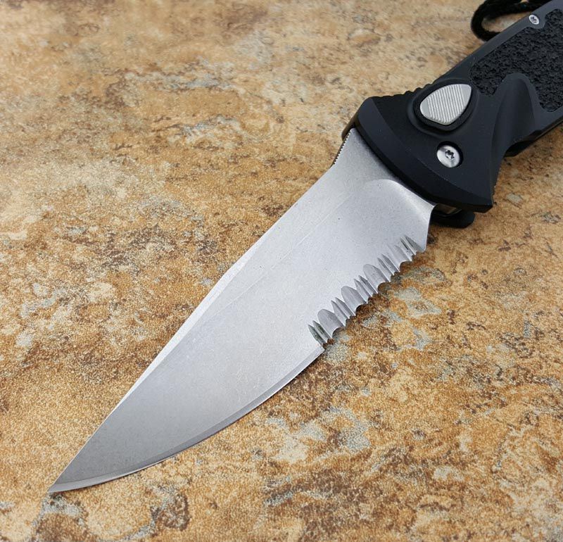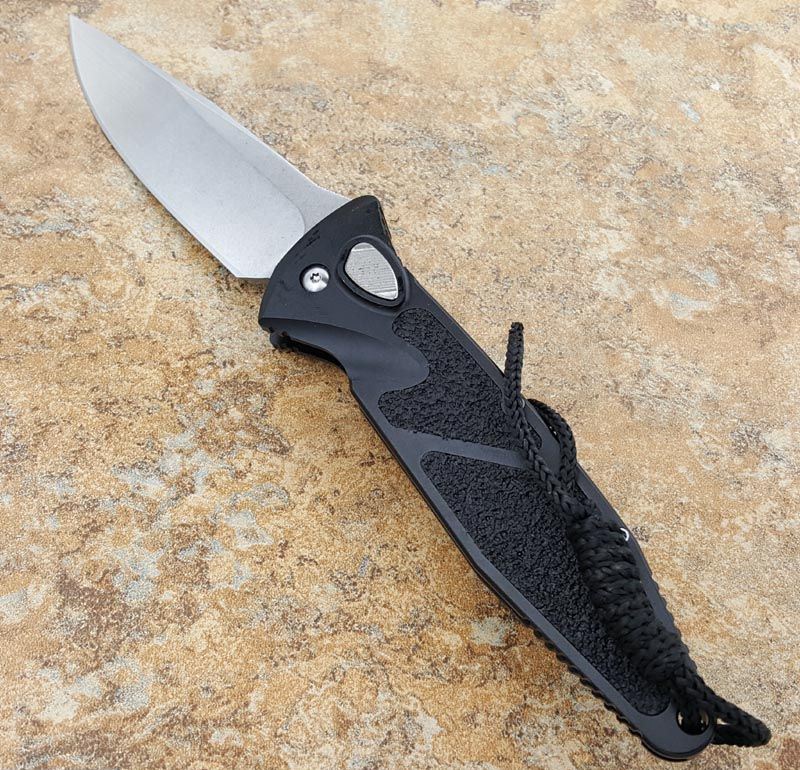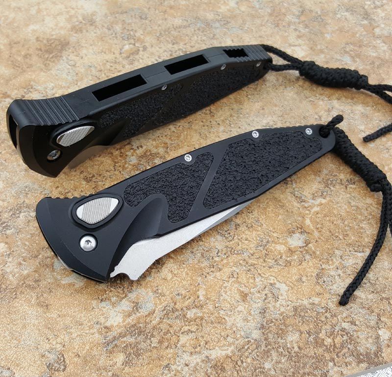 微技术海豹突击精英侧跳刀 全长:9.20 英寸 刀刃处理:石洗 刃长:4.00 英寸 刃材料:D2 使用控制:优越 撞击器:没 柄颜色:黑 柄防滑:3M砂皮 柄材料:6061航空铝 模式:侧跳 型号:海豹突击精英 模式:单动作侧跳 夹子:背夹