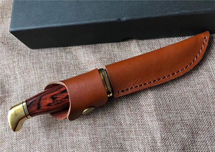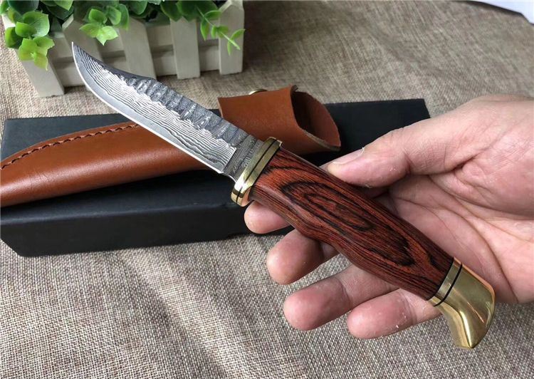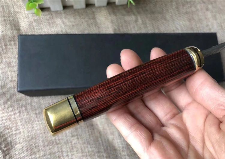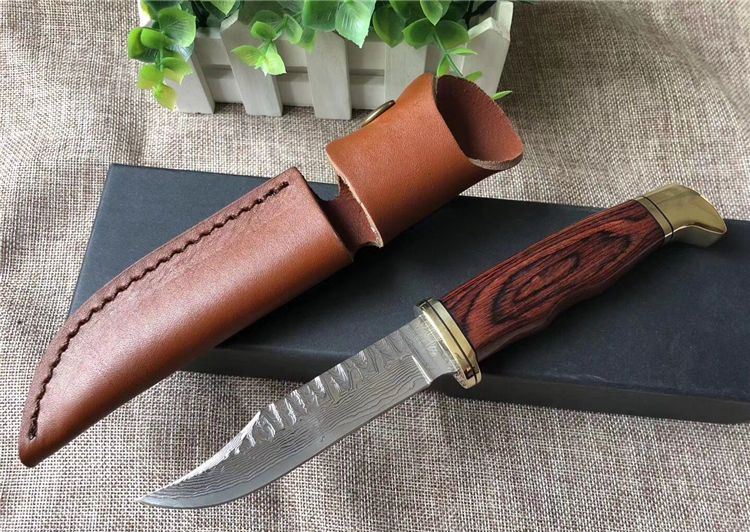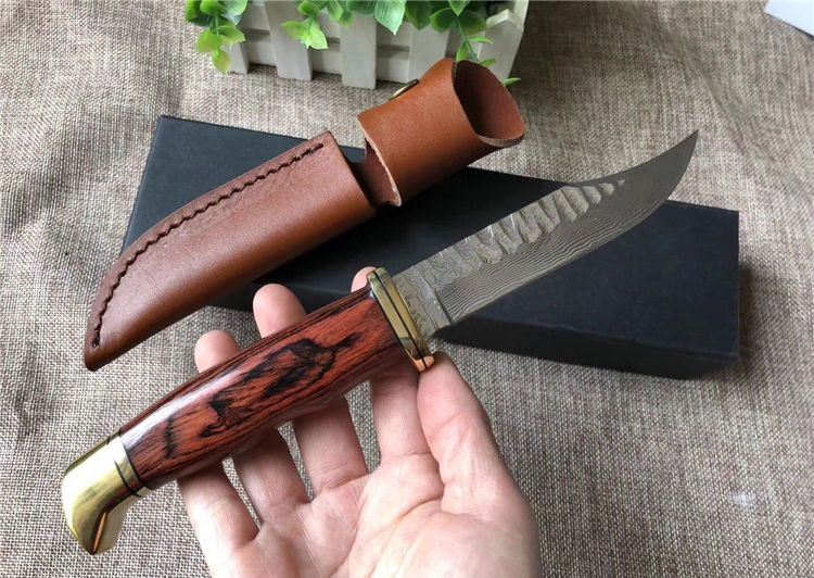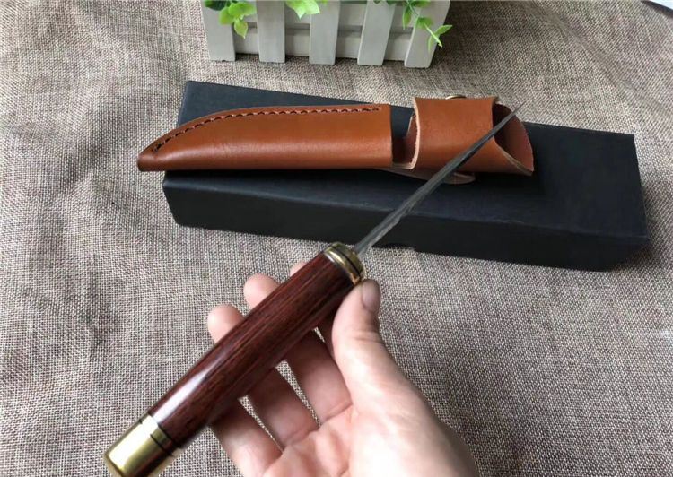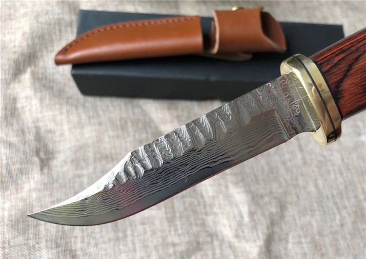 雪鹰大马士革猎刀 全长: 23.8cm 刃长: 11.5cm 柄长: 12.0cm 刃宽: 3.0cm最宽处 刃厚: 0.3cm 柄材: 铜头,彩木 刃材: 进口大马士革钢 重量:476g含包装 其他: 普通礼盒,头层优质牛皮套