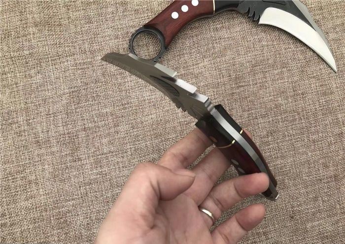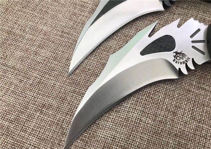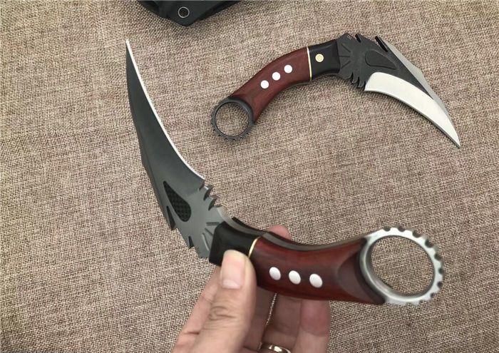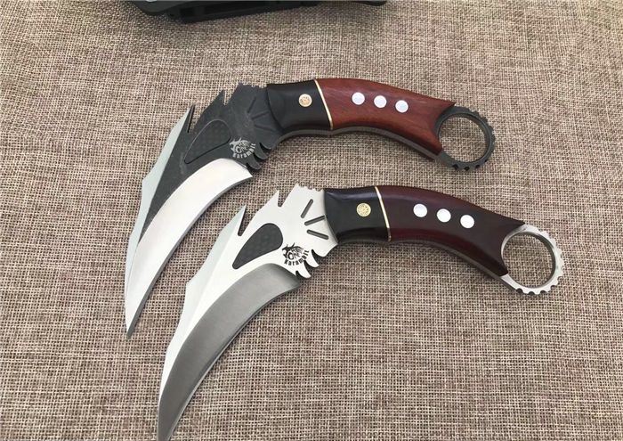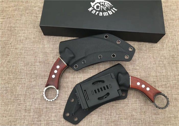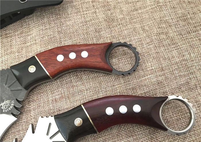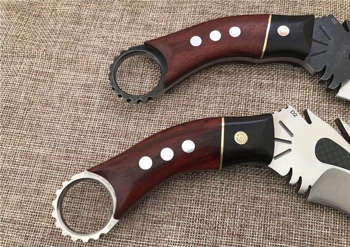 THE ONE不死鸟手工爪刀 全长:20CM 刃长:9CM 柄长:9.4CM 刃厚:0.5CM 刃材料:D2 硬度:59-60HRC 表面:碳纤+沧桑石洗或砂光 刀套:美国进口Kydex 重量:300克(带鞘) 刀柄:黑檀木+铜片+科檀木+G10片 其它:配精品礼品盒