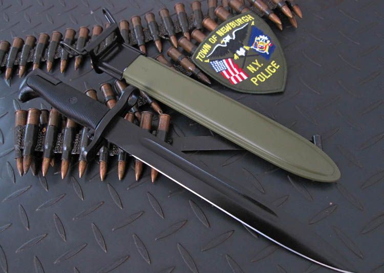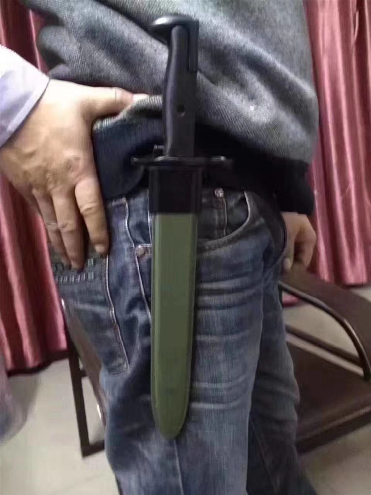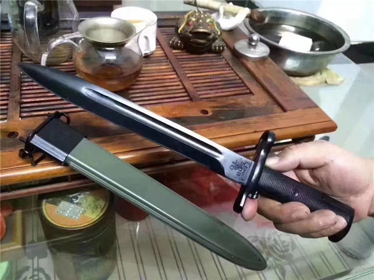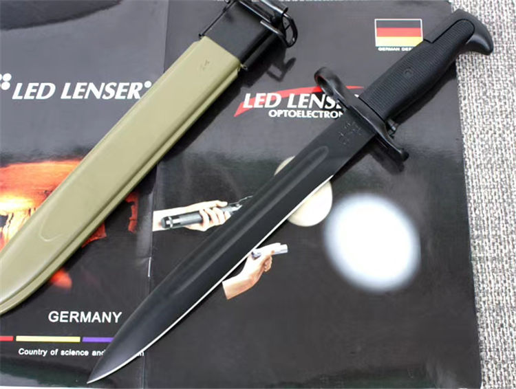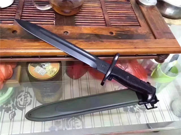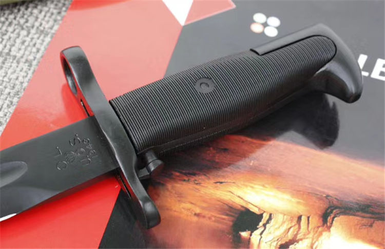 精仿二战美军M1(中号) 全长:36.5cm 刃长:25cm 刃宽:2.9cm 刃厚:0.6cm 刃材:65#锰钢 硬度:58HRC (砍普通的铁丝不伤刀刃)表面:高温黑漆 柄材:精铸钢+纤维塑料(带防滑条纹) 柄长:11.5cm 净重:500克 毛重:660克(含包装物) 刀鞘:纤维塑料刀鞘,鞘口有钢套,可穿腰带 其他: 刀把有一个卡仔,可以卡住刀鞘,防止滑落