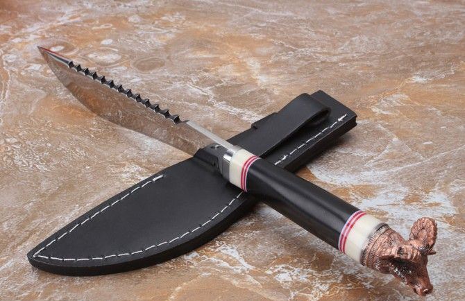 羊头小名捕弯刀 全长:34.9厘米 柄长:13.4厘米 刃长:20.8厘米 厚度:0.5厘米 宽度:3.6厘米 刃材:高碳钢 硬度:58-60 重量:370g 含包装 刀面:超镜光面 柄材:仿牛骨,铜羊头 刀鞘:皮套
