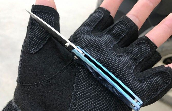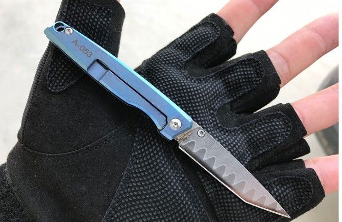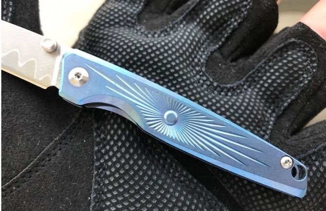 蓝箭钛合金柄匙扣小折刀 全长: 13.1cm 刃长:5.8cm 柄长:7.2cm 刃宽:1.3cm 刃厚:2..2mm 刃材:进口M千层钢 刀重:52g含包装物 硬度:58-60HRC 表面:千层原花纹 锁型:则锁 柄材:钛合金手柄经CNC成型,配铁礼品盒