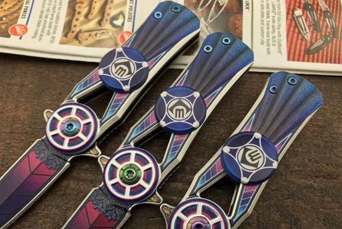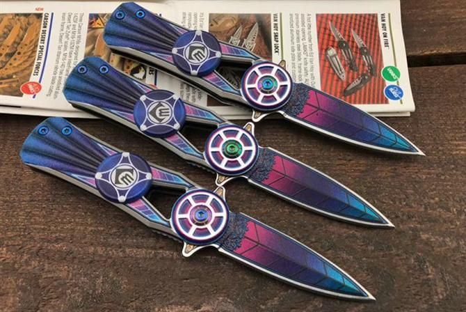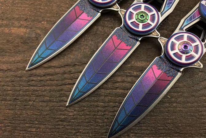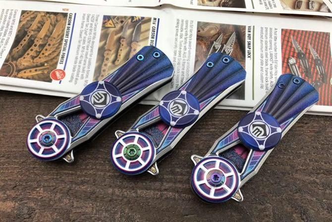 CM76彩钛陀螺折刀 全长:14.5cm 刃长:6cm 柄长:8.5cm 刃厚:2.5mm 刃材:3铬不锈钢 柄材:铝合金 CNC轴承