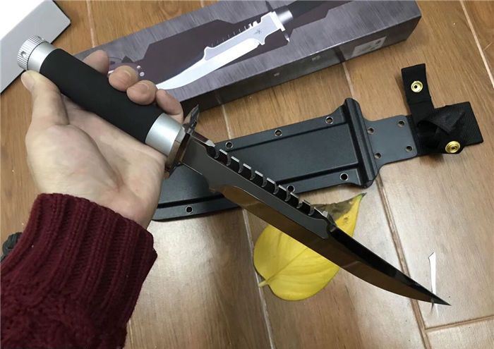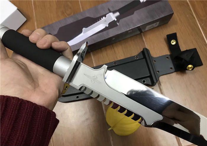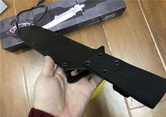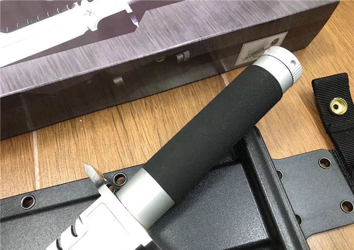 刀柄:配特殊防滑涂层 手柄内配救生工具组 指南针 密封圈 K鞘 牛皮绑都绳 彩盒