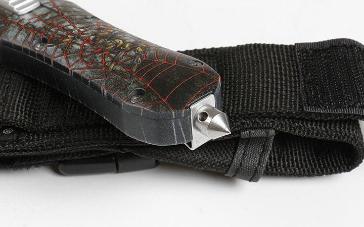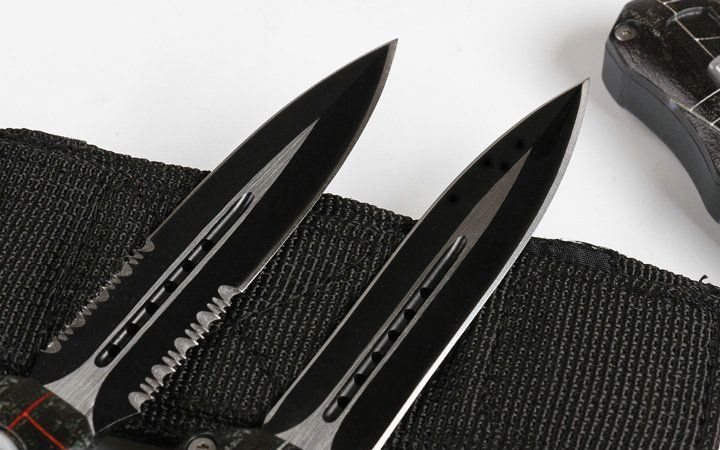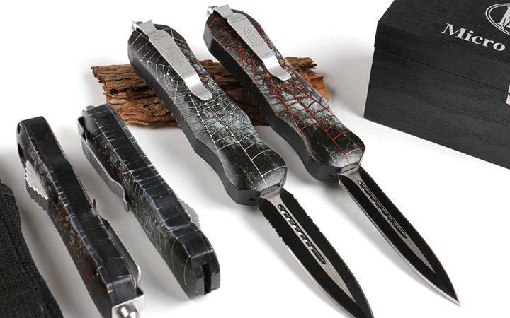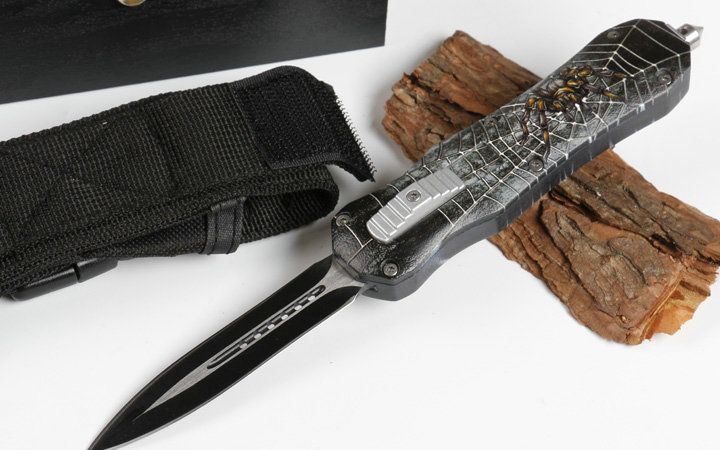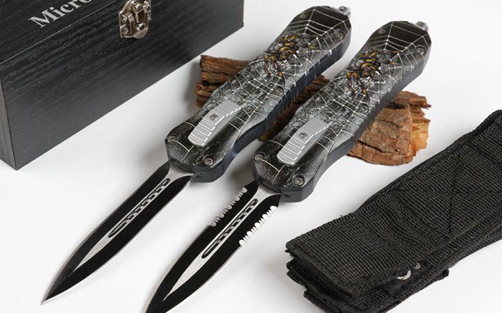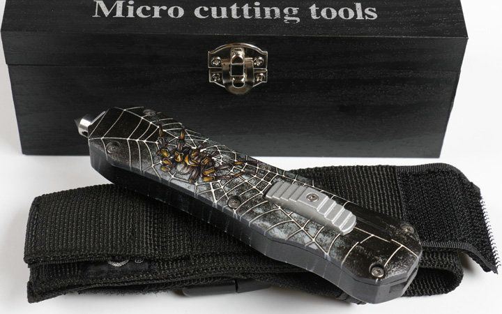 微技术白蜘蛛直出弹簧刀 全长:21.8cm含尾锥长度 刃长:8.8cm 刃厚:3mm 刃材:440 硬度:57HRC 总重量: 460.0克含包装物 表面:黑钛伴拉丝刀刃 柄材:锌铝合金 刀鞘:尼龙 锁闭:弹簧直出 备注:带背夹+木盒,双锋和双锋半齿,下单备注下