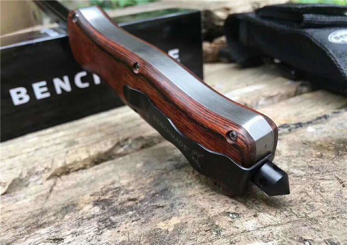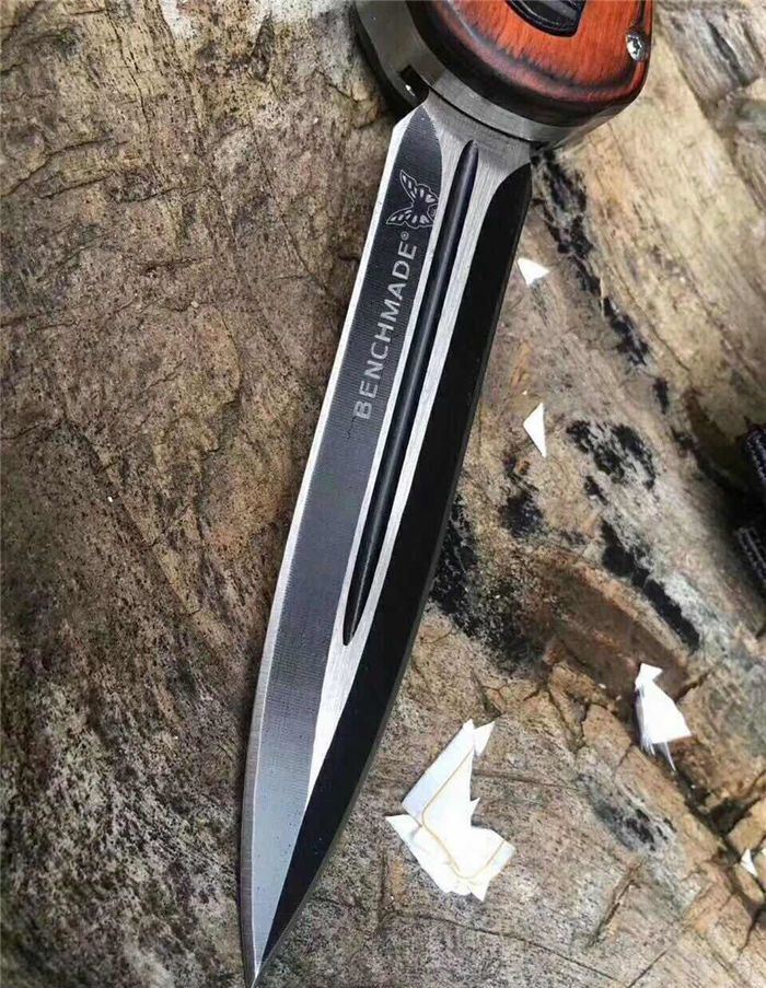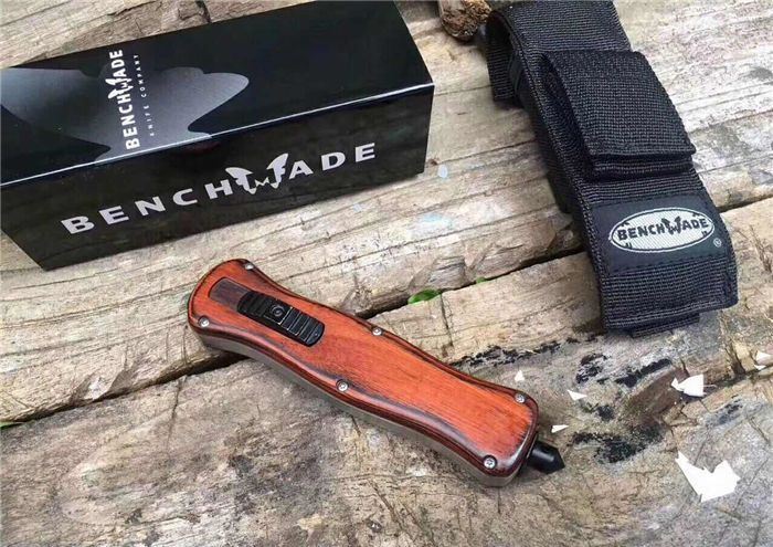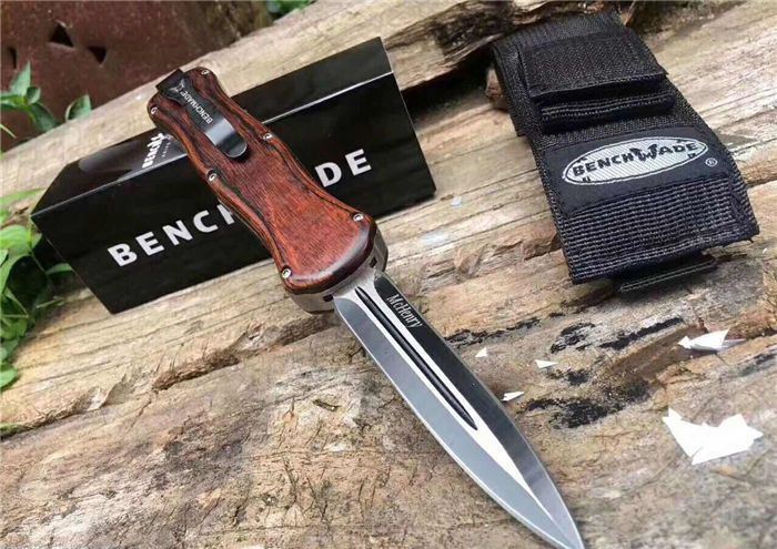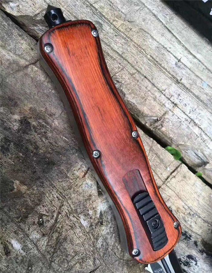 蝴蝶A016双动弹簧跳刀 全长:22.9cm 刃长:9.7cm 刃厚:1.6mm 刃材:D2 硬度:59HRC 刀重:204g 毛重:287g 表面:镀钛 柄材:锌铝合金,檀木,彩贝壳 刀鞘:尼龙 锁闭:直出弹簧刀