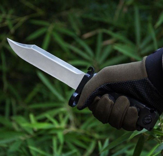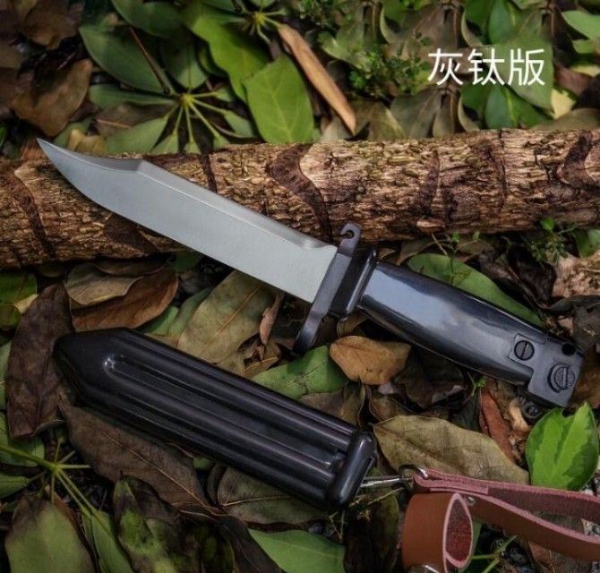 56S式刺刀 全长:27.8CM 刃长:14.8CM 刃厚:0.6CM 钢材:7CR17 柄材:ABS军用塑料 刀鞘:ABS 表面:砂光灰钛 硬度: 59HRC 重量:418g 外贸型:86S式5.56自动步枪刺刀