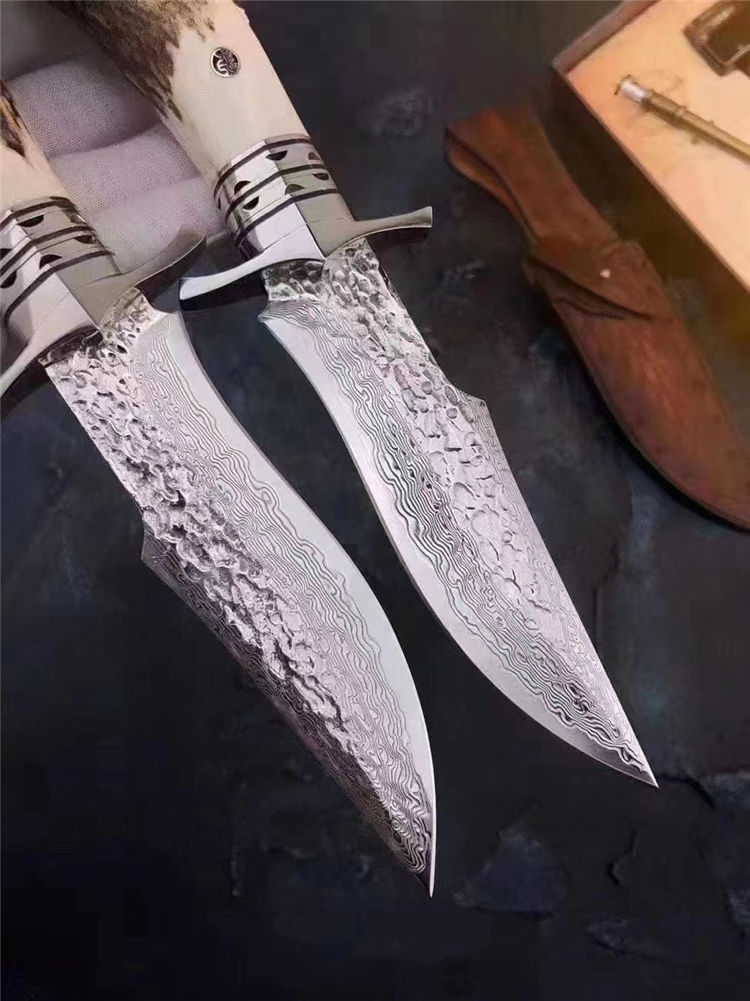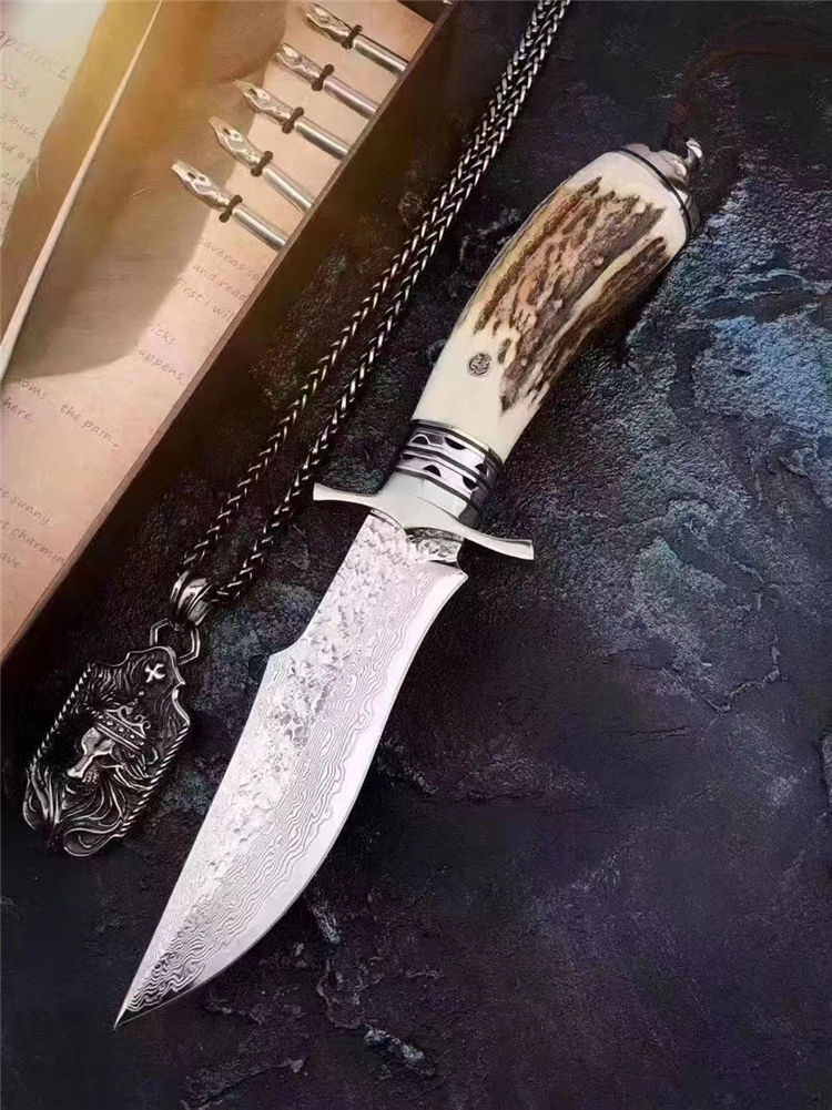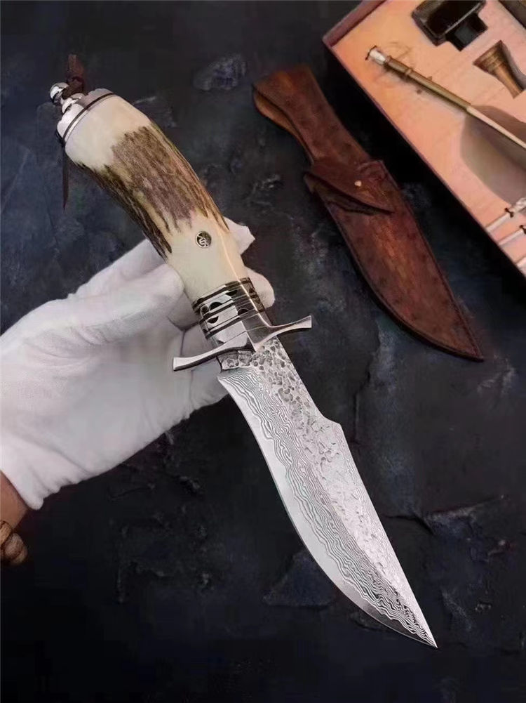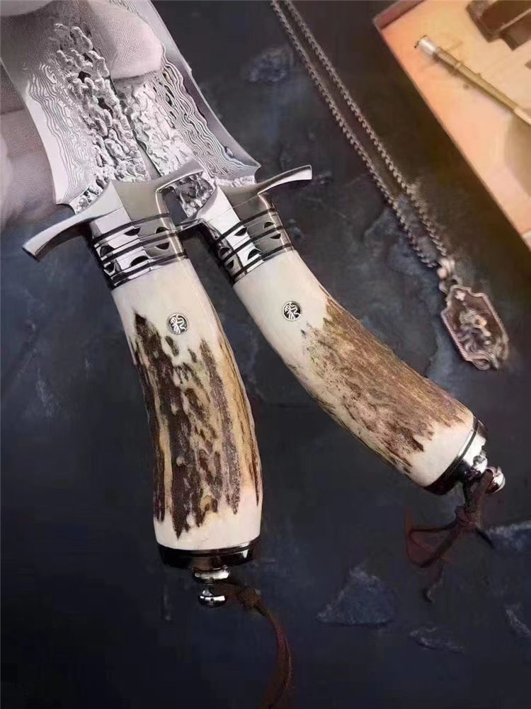 布克斯博弈大马士直刀 全长:26cm 刃长:13cm 手柄长:12cm 刃钢材:进口大马士革钢(真空热处理) 硬度:60HRC 刃厚度:4.1MM、 刀刃钢材:进口大马士革钢(硬度60HRC)刀刃锋利无比、坚不可摧 皮套(进口复古植鞣皮雕花手工缝制刀套) 手柄材料:S型双护手钢头+白钢刻花+精挑天然鹿角+手柄尾部皇冠帽+白蝶贝 皮套:进口阿根廷植鞣手工缝制雕花皮套 包装配置:高级精礼品盒+护刀油1瓶