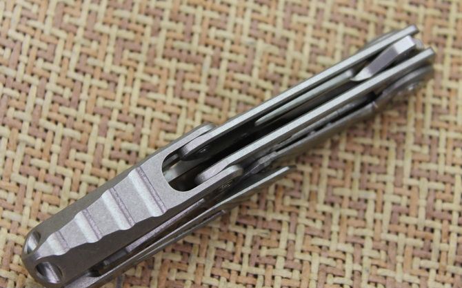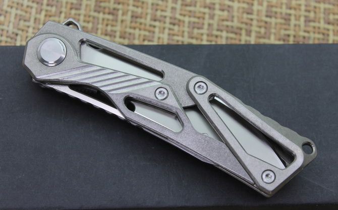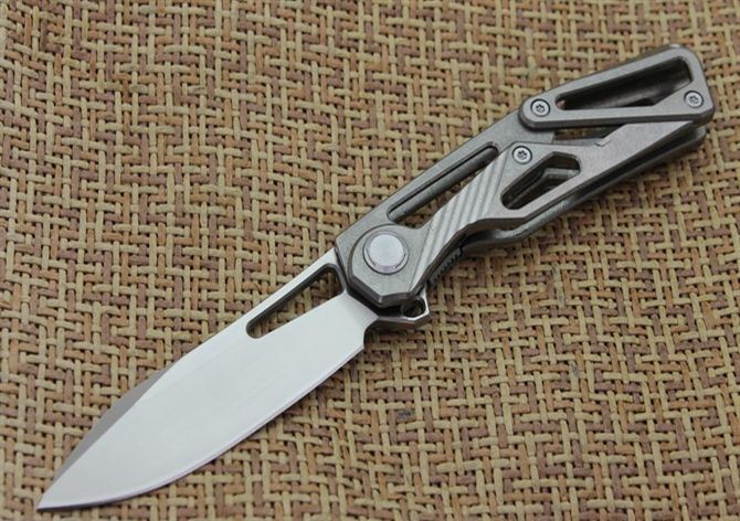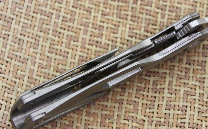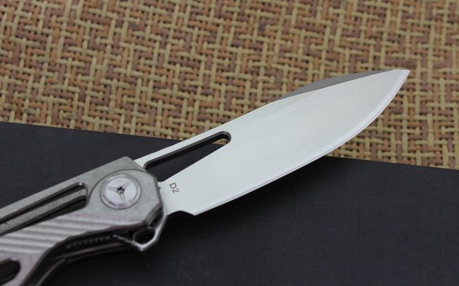 二体D2钢全钛柄构造刀 全长:22cm 刃长:9cm 柄长:11cm 刃最宽:2cm 刃厚:4mm 刃材:D2钢(精细沙光处理) 刀重:120g 总量:190g(含包装物) 硬度:59-60HRC 表面:手工磨沙 柄材:正反面CT-4钛柄二体构造刀 刀夹:超弹力钛夹 锁型:线锁 螺丝:所有螺丝420不锈钢硬度HRC45,全CNC精雕加工,内置轴承 结构:线锁锋利