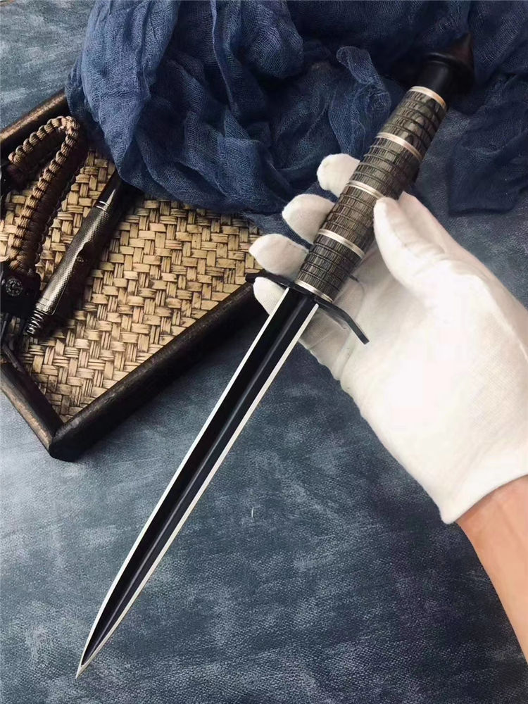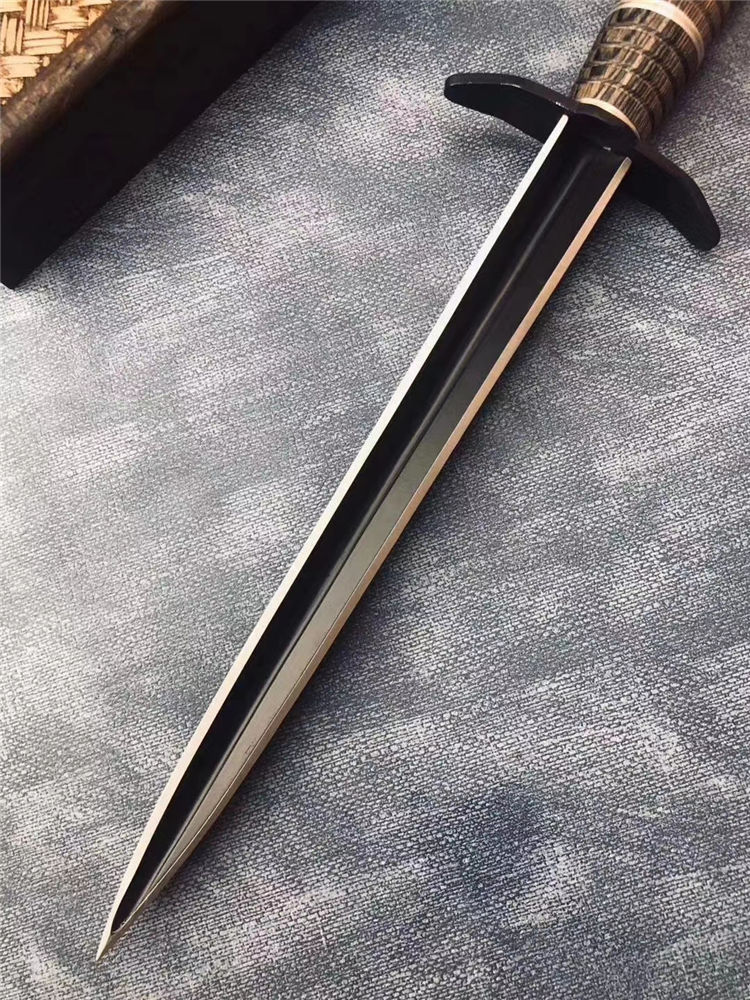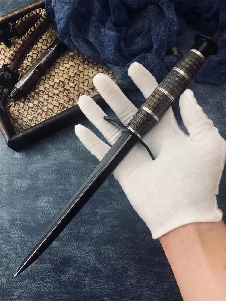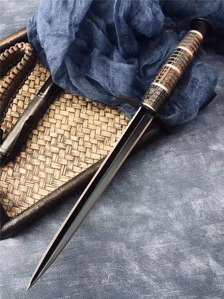 古罗马经典黑三棱 长度:34.3CM 刃长:20.3CM 刀条直径:1.8CM 重 量: 320g 硬 度: 56HRC 刀材质:不锈钢 柄 材:花梨木+钢环+铜环 表面处理:电泳黑化 其他:尼龙刀套