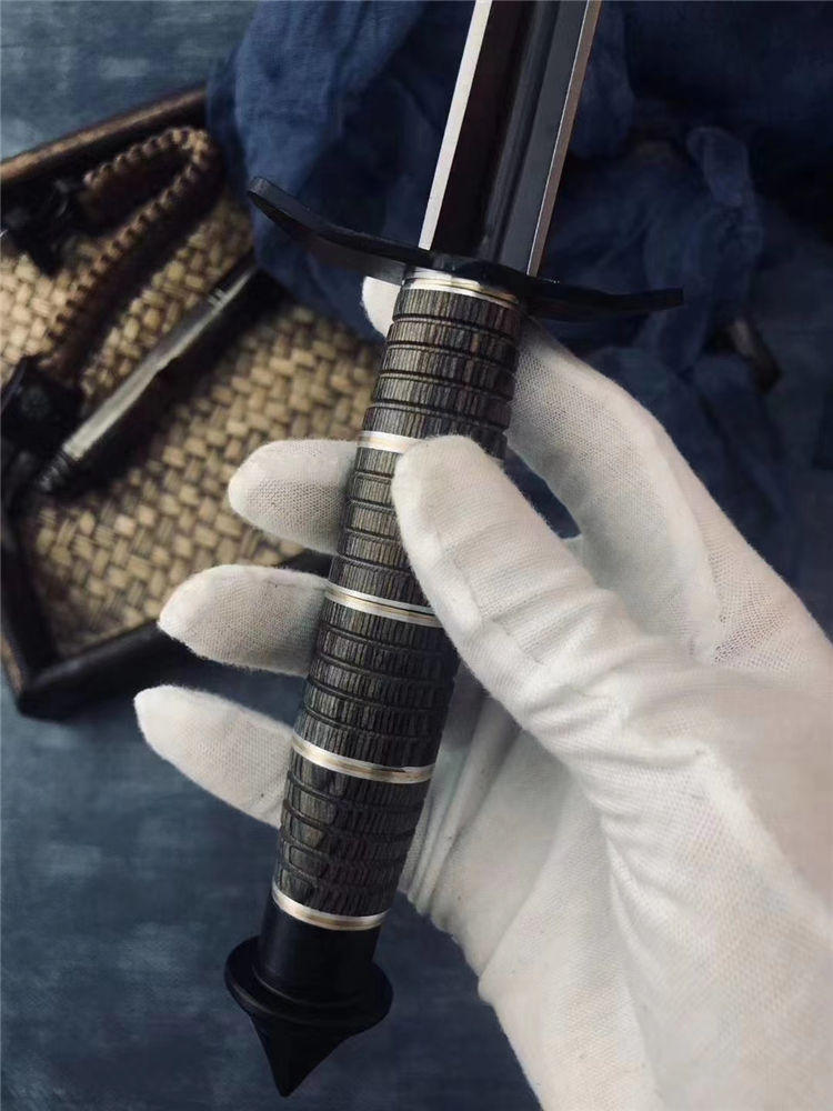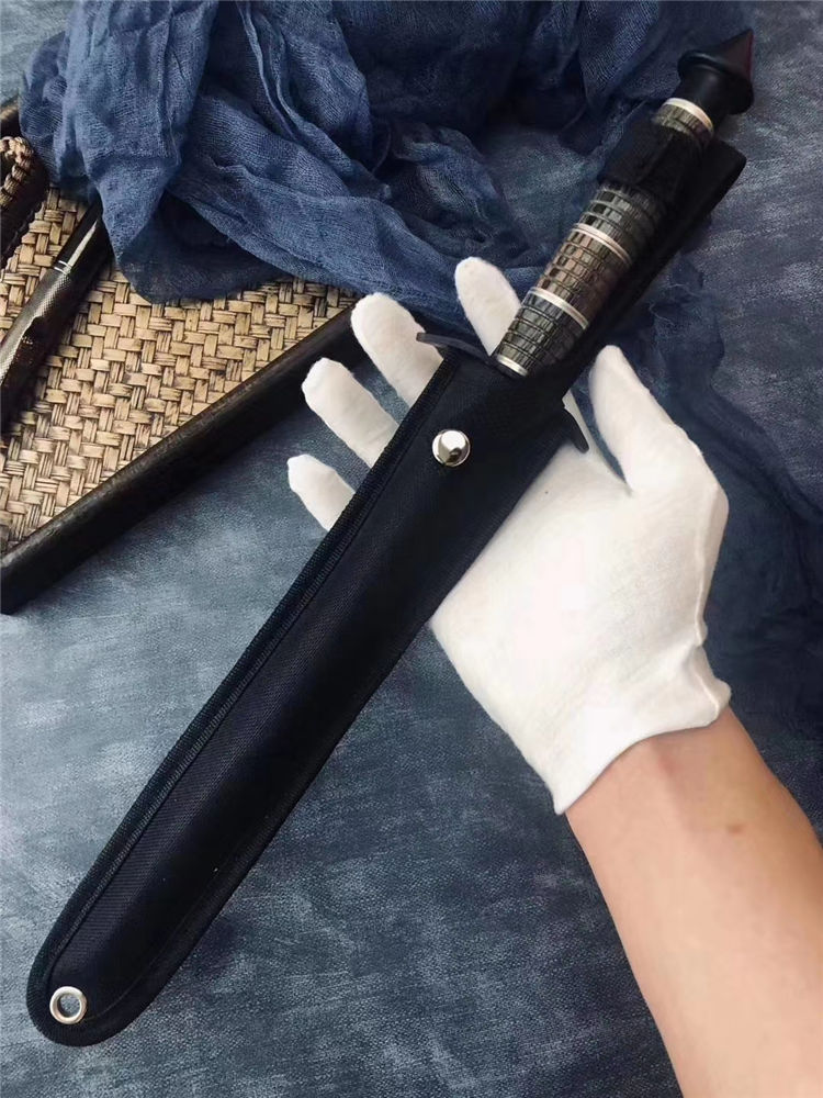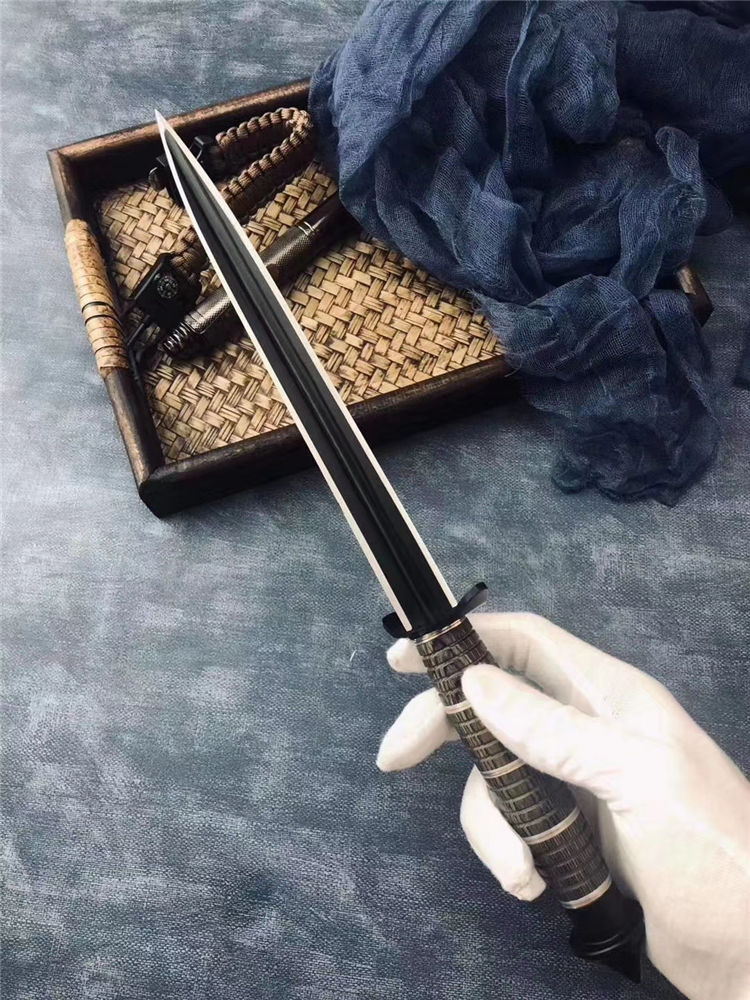 刃长:20.3CM 刀条直径:1.8CM 重 量: 320g 硬 度: 56HRC 刀材质:不锈钢 柄 材:花梨木+钢环+铜环 表面处理:电泳黑化 其他:尼龙刀套