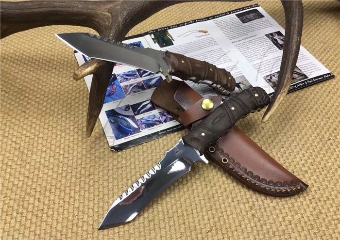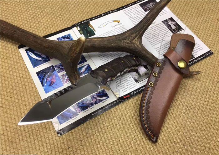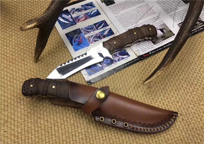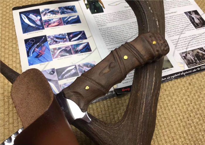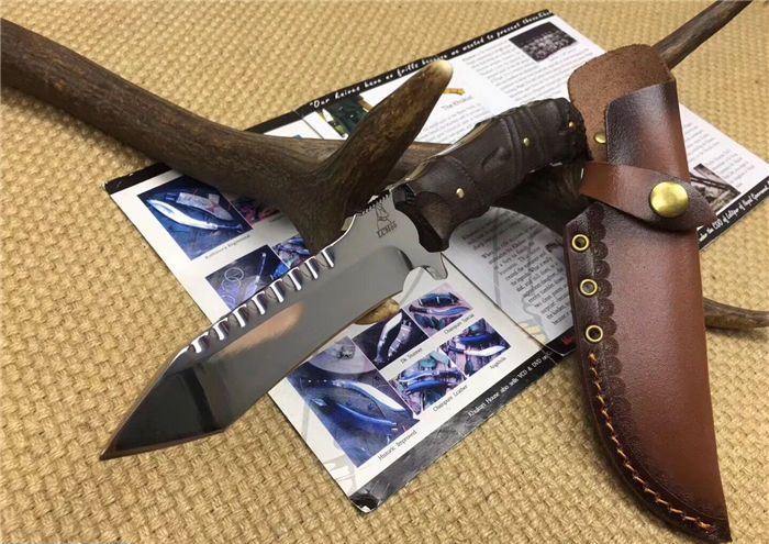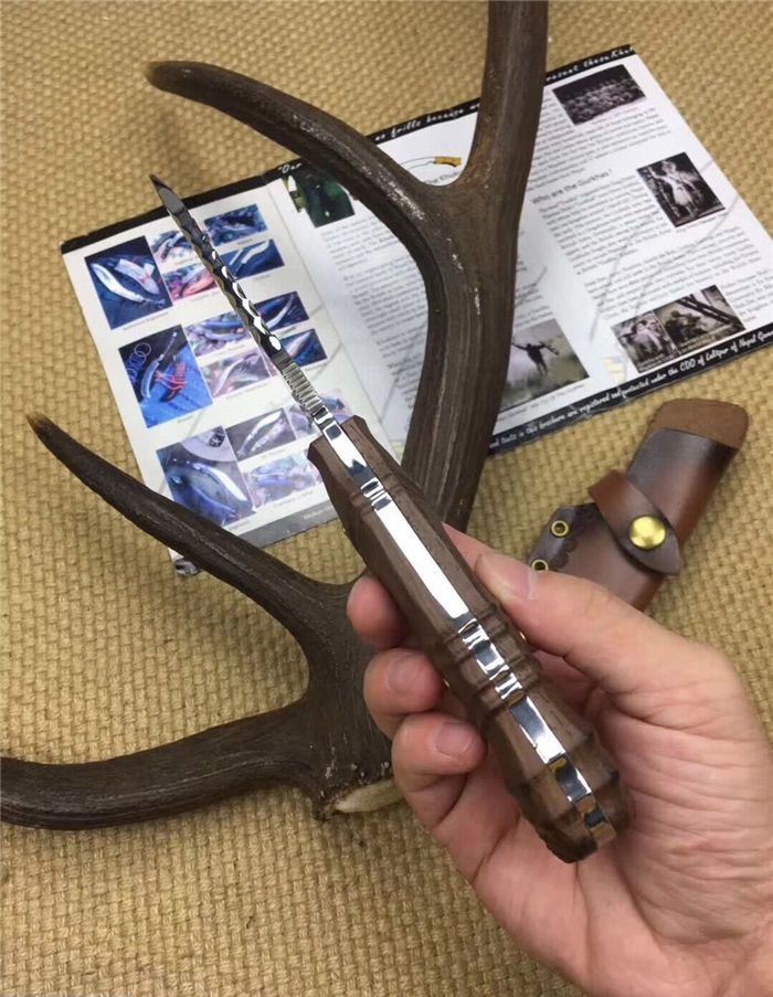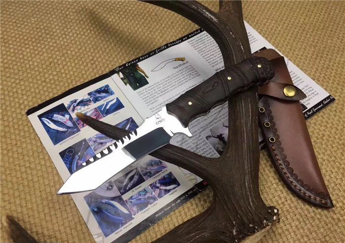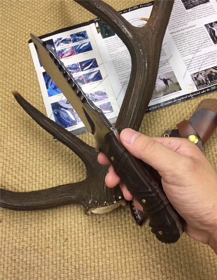 千年齿锥直刀 全长:24CM 刃长:12CM 柄长: 11.5CM 刃材:7Cr17 硬度: 58HRC 刃厚: 0.5CM 刃宽:3CM (最宽处) 涂层:镜光 柄材: 黑檀木(手工雕刻) 刀鞘:皮套 重量:480g(含包装) 其他:非一般的手工!