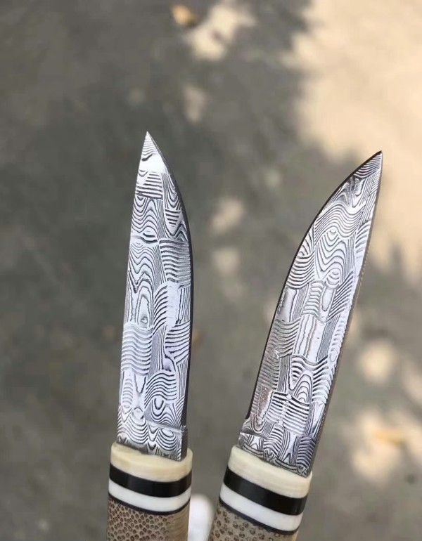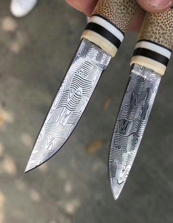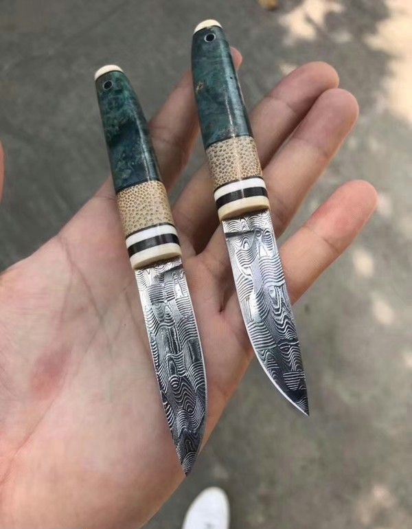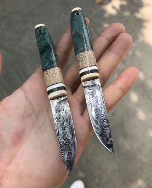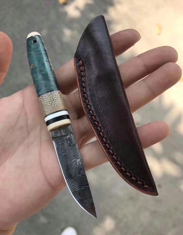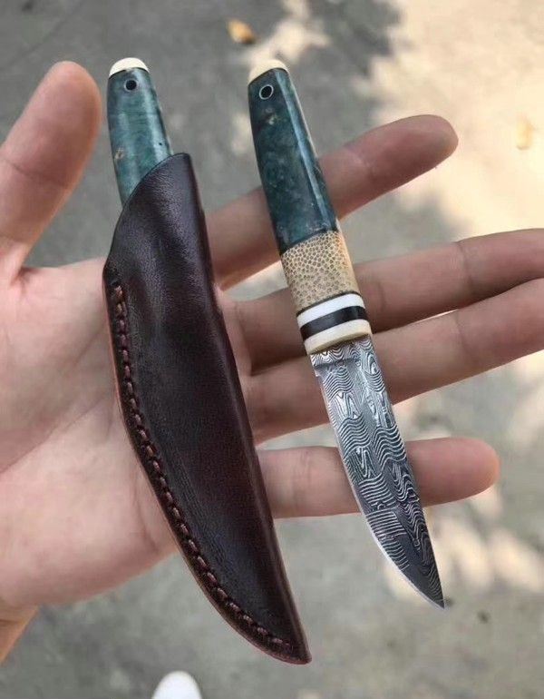 TUREN高档美国进口瑞粉大马士革钢直刀 全长:13.8cm 刃长:5.5cm 刃宽:1.5cm 刃厚:2.5mm 刃材:瑞典粉末大马士革钢 硬度:60HRC 柄材:俄罗斯稳定化木镶嵌西伯利亚猛犸长毛象的牙+石竹 刀鞘:配头层牛皮,雕花刀鞘