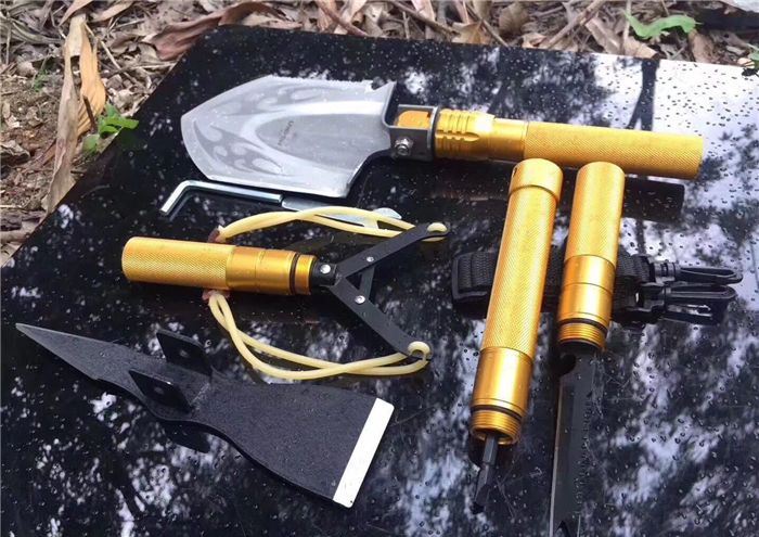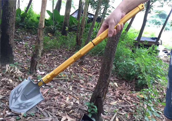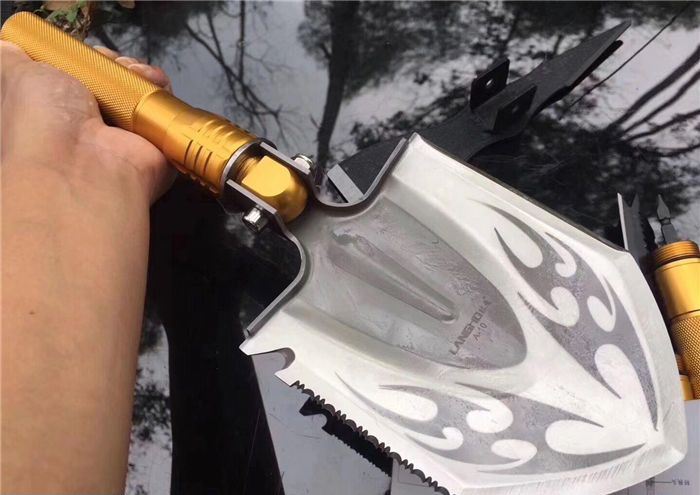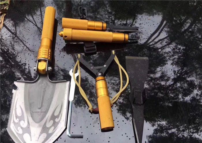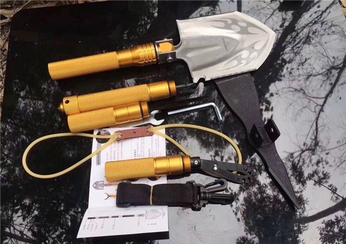 新款A10兵工铲加装锄头、弹弓、茅头 多用途工兵铲 功能有:开瓶器,锤,斧,刺,铲,揪等15项功能 可任意折叠 送迷彩收纳袋