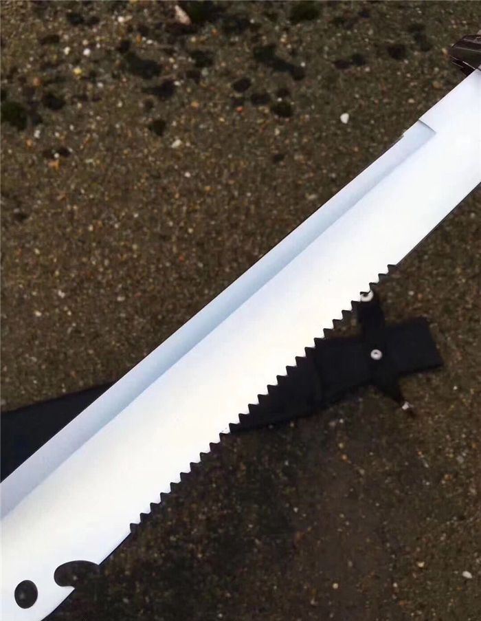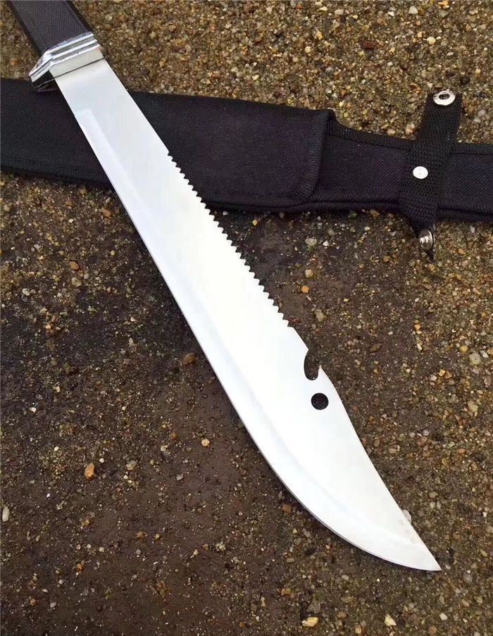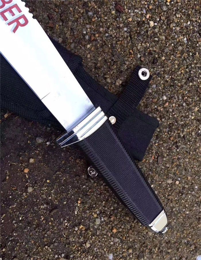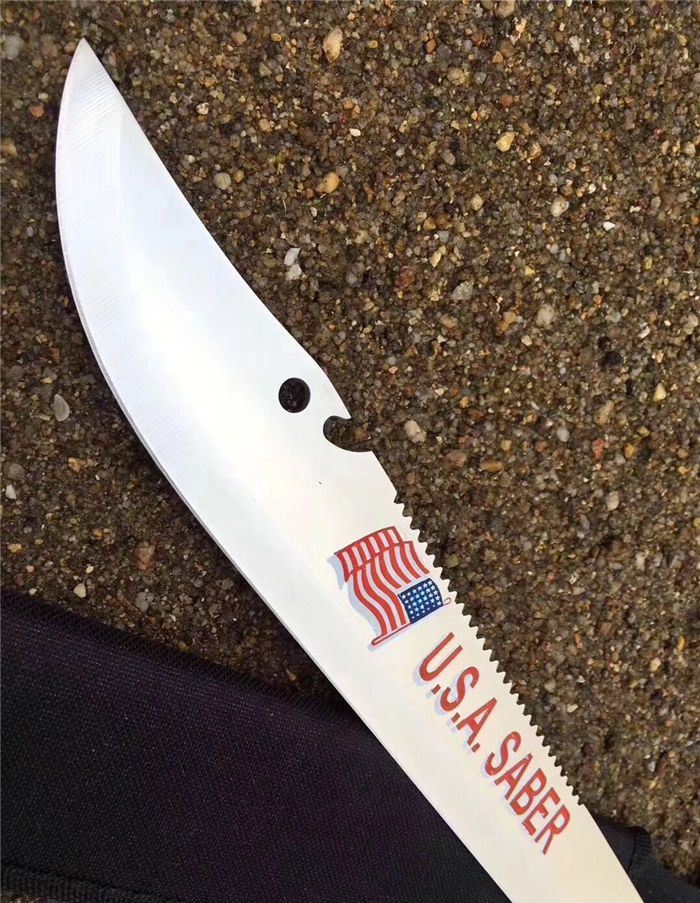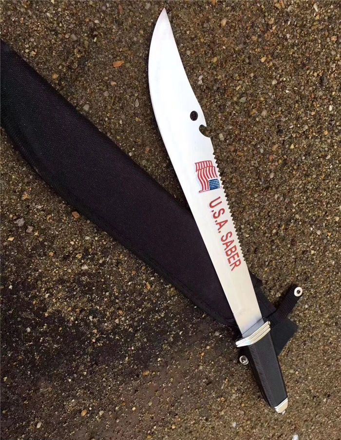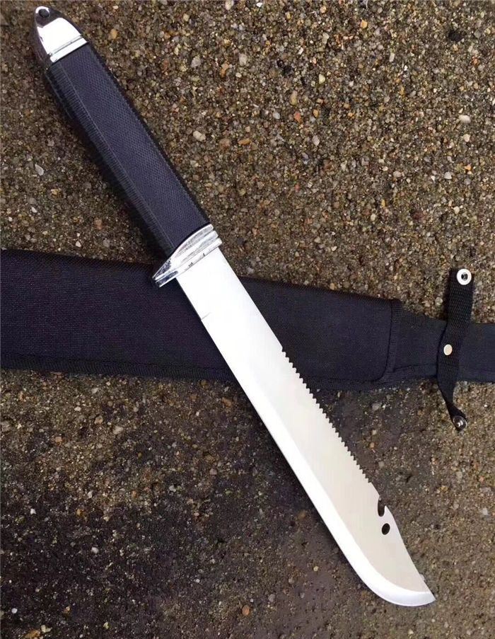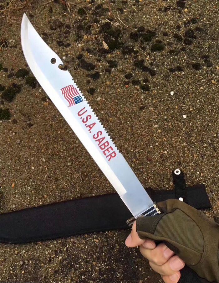 USA开山刀 全 长:52cm 刃 长:41cm 刃 厚:3.5mm 刃 材:420J2 柄 材:橡塑 硬 度:57Hrc 表 面:氧化黑 刀 套:尼龙 净 重:450g