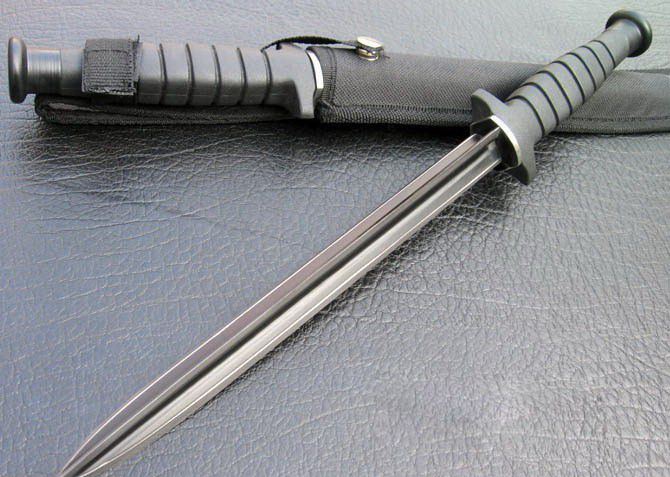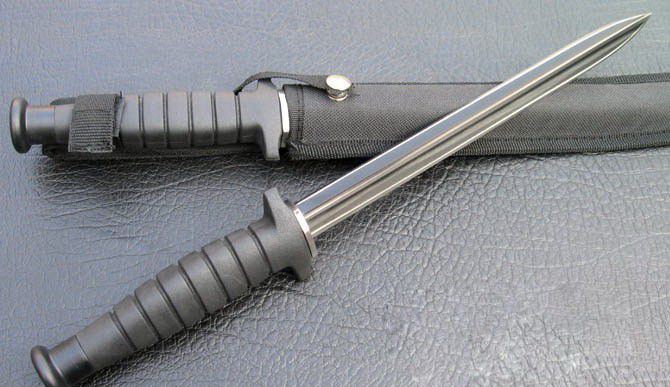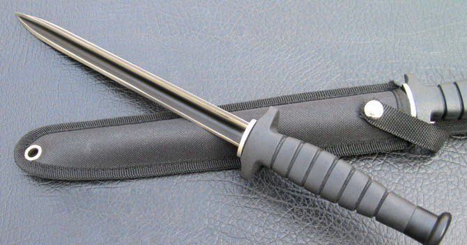 黑版三棱刺 长 度:36.5CM 刃 长:23.5CM 刀直径:1.8CM 重 量: 360g 硬 度: 56HRC 刀材质:高碳不锈钢 柄 材:橡塑 表面处理:电泳黑化 尼龙刀套。
