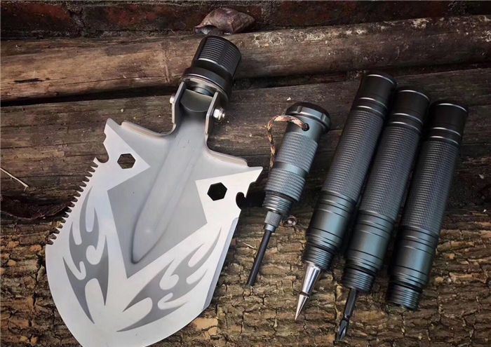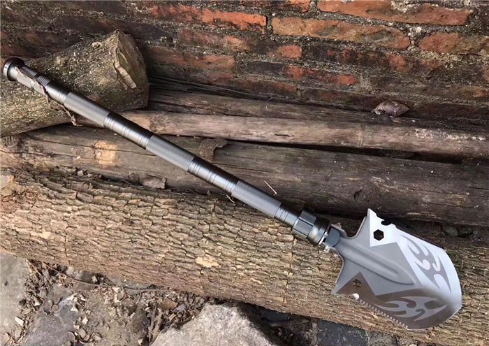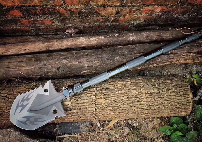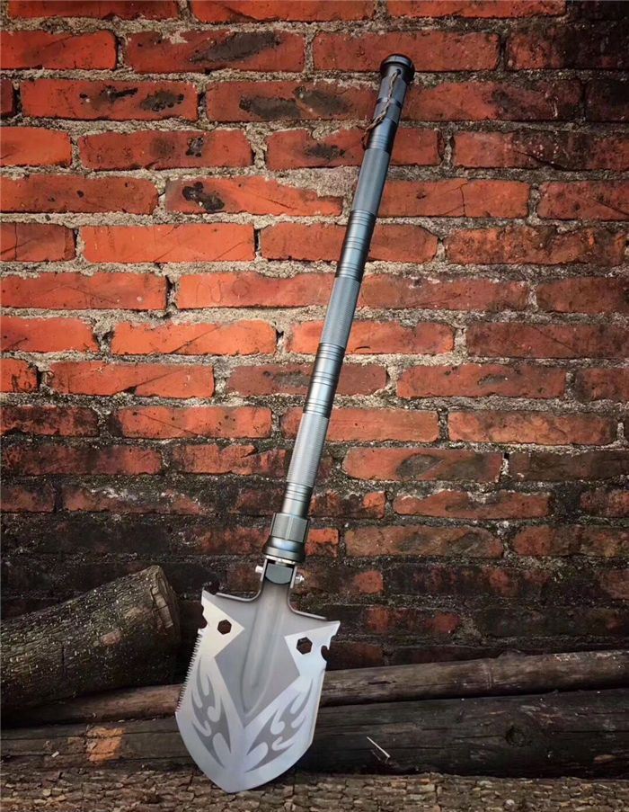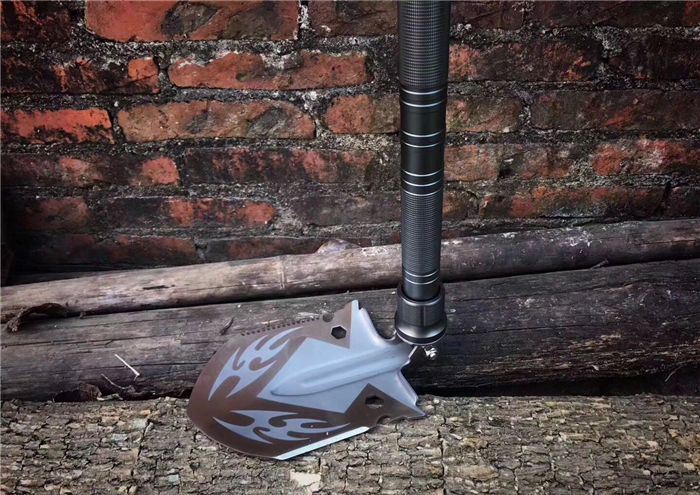 功能:有铲,锄 ,锯,多功能小刀,割,打火棒,指南针,丝批,哨子.乌钢撞玻器等功能,在生产工艺上采用上好淬火高碳钢,增加强度,抗磨损,抗腐蚀,耐高温等优势.有把铲在手,登山,外出永不怕。