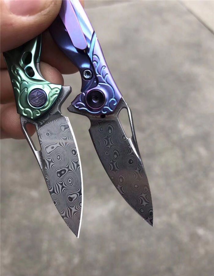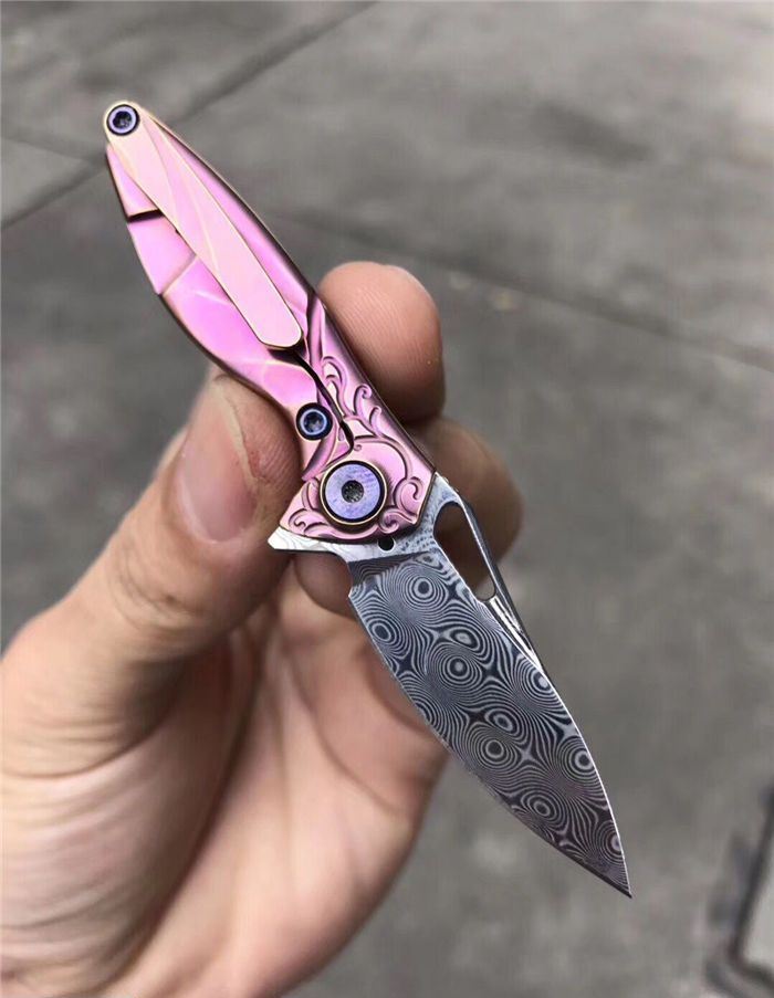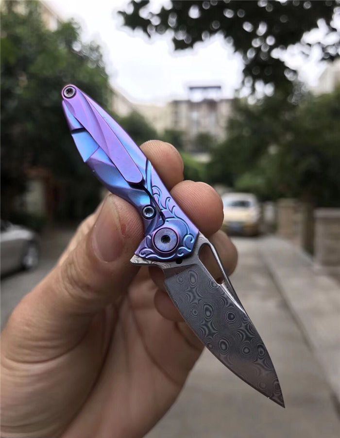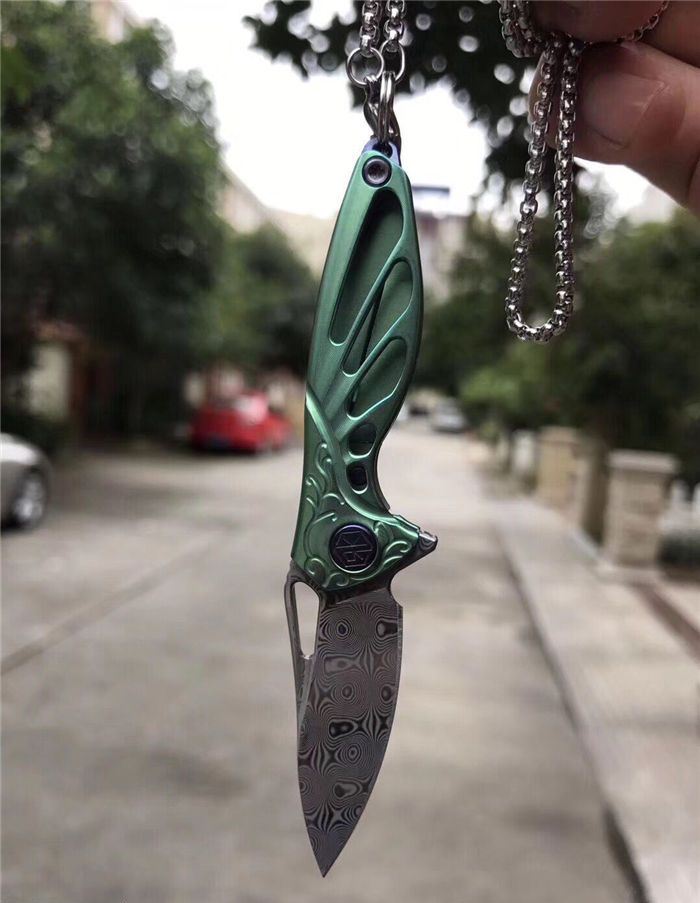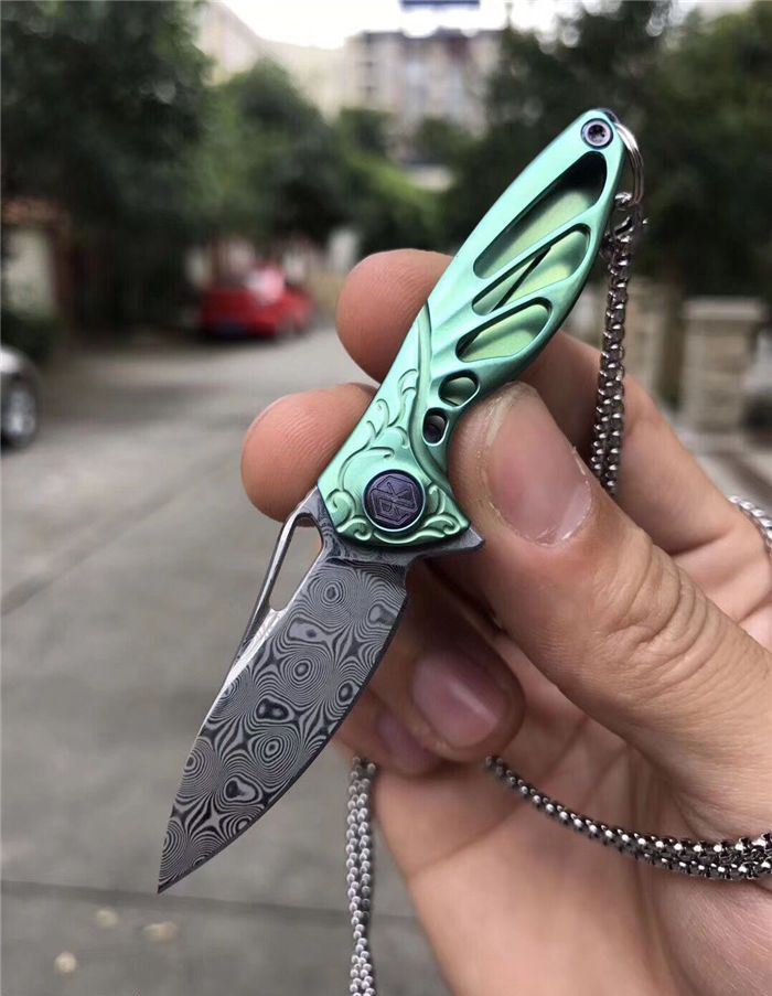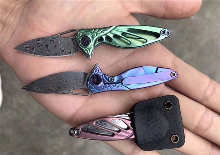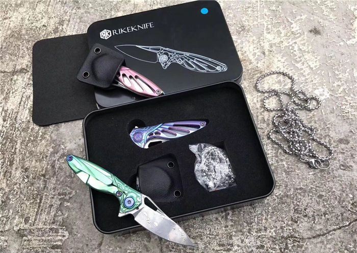 RIKEKNIFE迷你瑞粉折刀 总长:9.8cm 刃长:3.8cm 钢材:进口瑞粉大马士革钢 柄材:TC4钛合金 配K鞘,链条