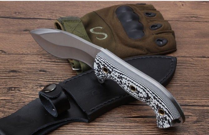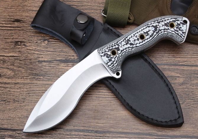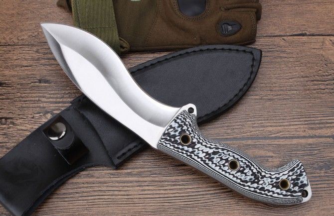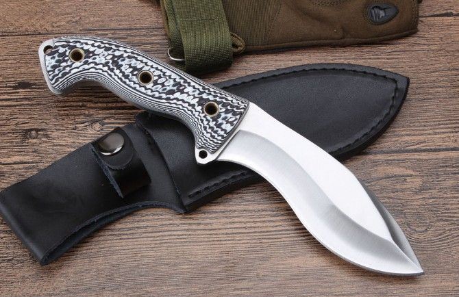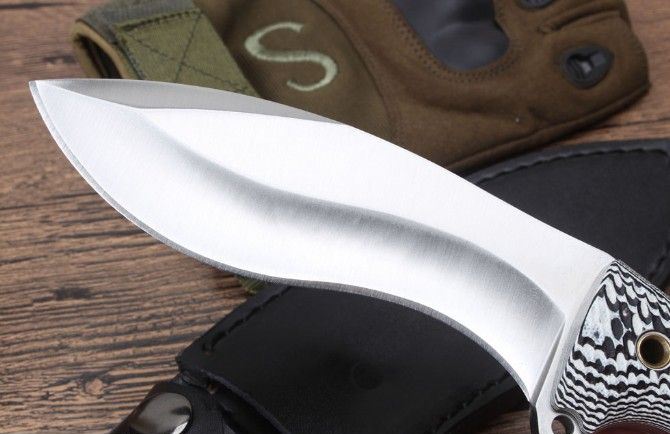 M唛狗腿刀 全 长:250cm 刃 长:13.1cm 柄 长:12.3cm 刃 厚:0.55cm 刃 宽:4.3cm 刃 材:8CR18MOV 柄 材:一体钢+米卡塔 硬 度:58HRC 净 重:511克(含包装) 锁 定:直锁 表 面:沙光 其 他:牛皮套+礼品盒