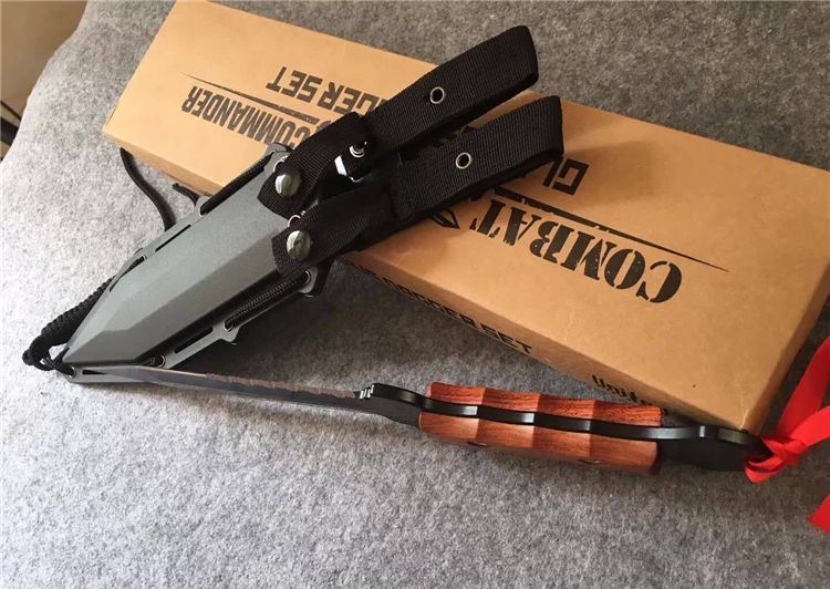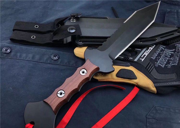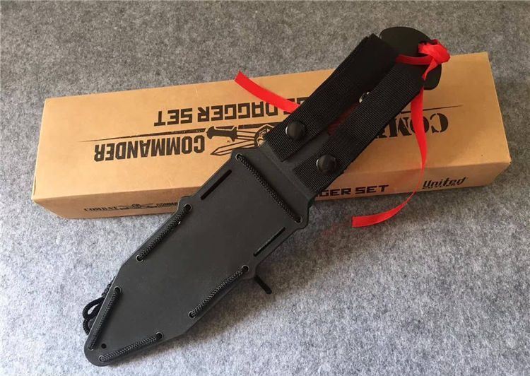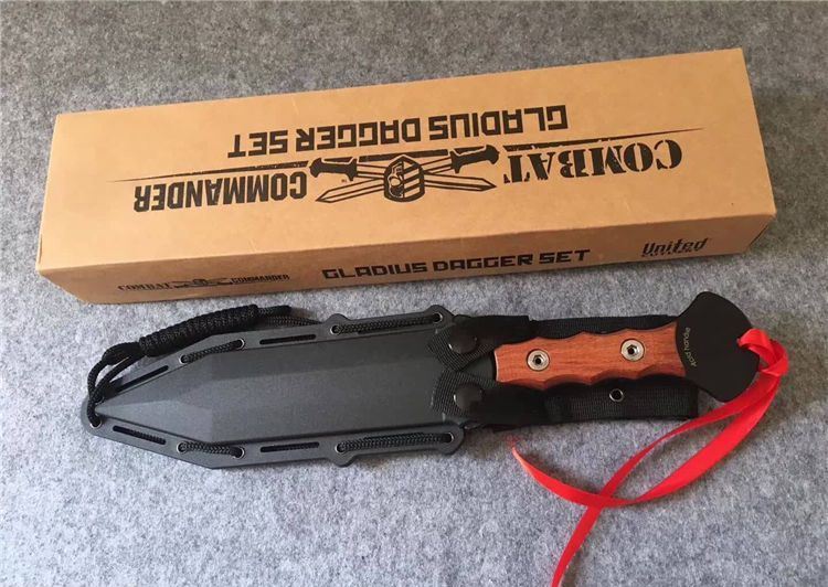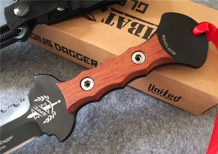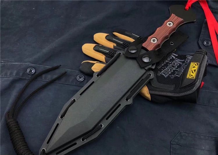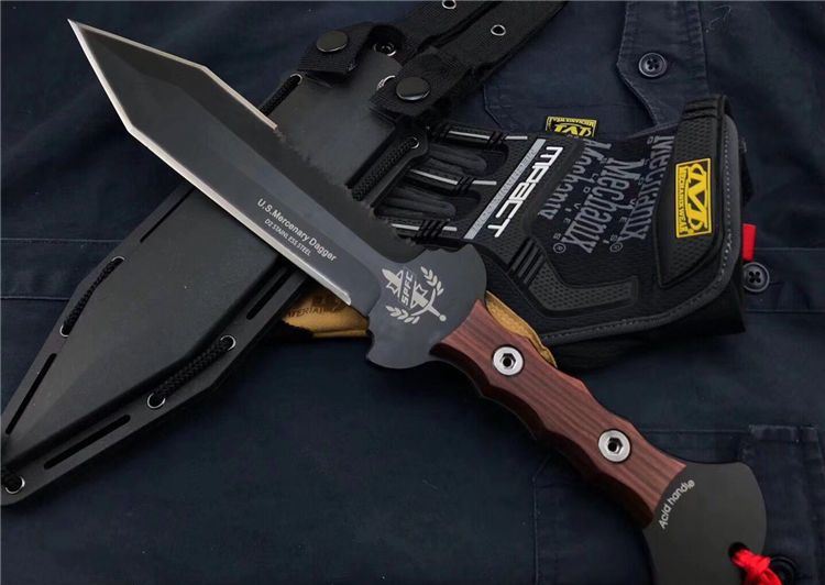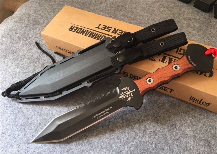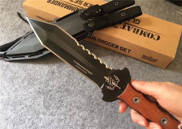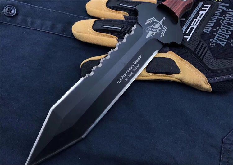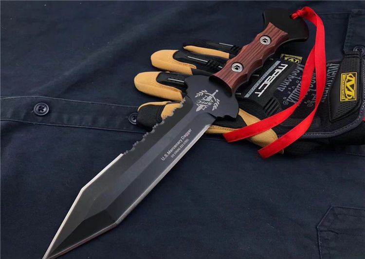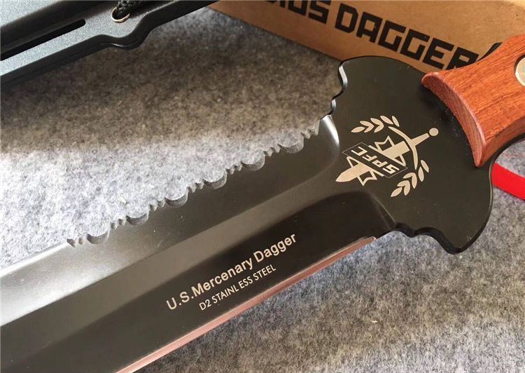 美国雇佣兵直刀 全长:34.5cm 刃长:21.9cm 刃厚:0.59cm 柄长:10.8cm 刃材:D2 表面:黑钛 硬度:58-60HRC 柄材:彩木 鞘材:ABS鞘 总重:700克(含包装)