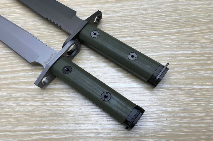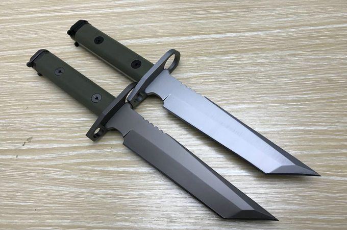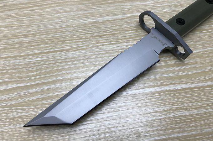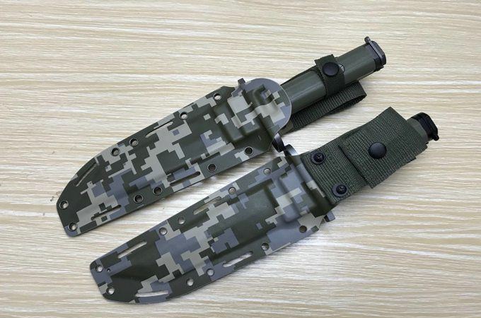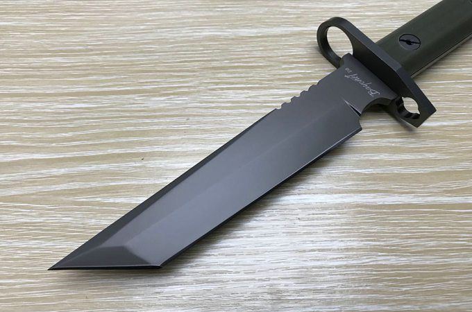 新D8军刺彩K鞘 全 长: 32cm 刃 长: 16cm 刃 宽: 3.7cm(最宽处) 柄 长: 13cm 刃 材: 8铬 硬 度: 58HRC 表 面: 钛离子 刃 厚: 0.5cm 柄 材: 龙骨结构,绿色G10柄片 总 重: 900g