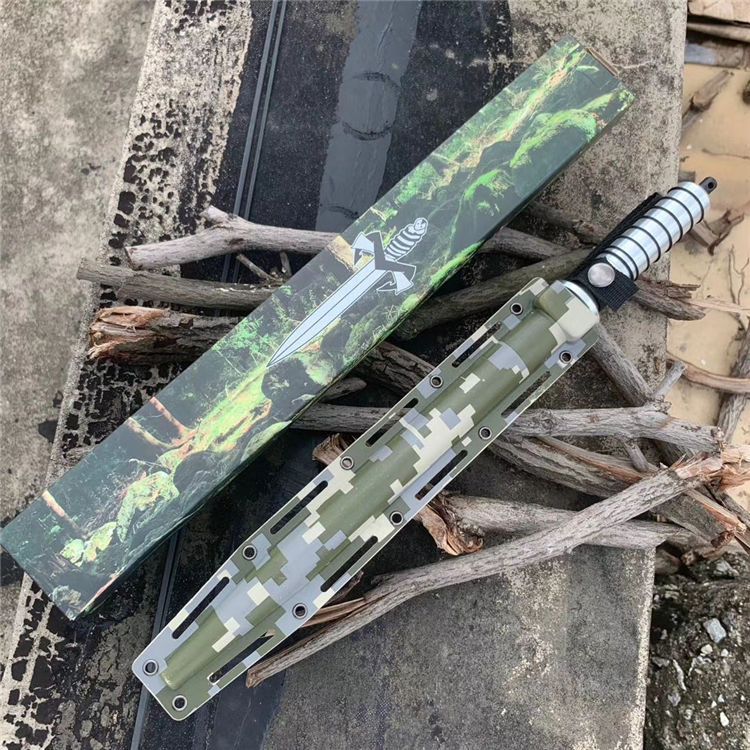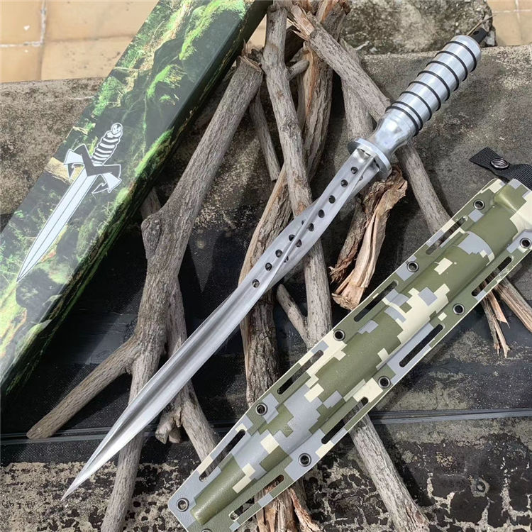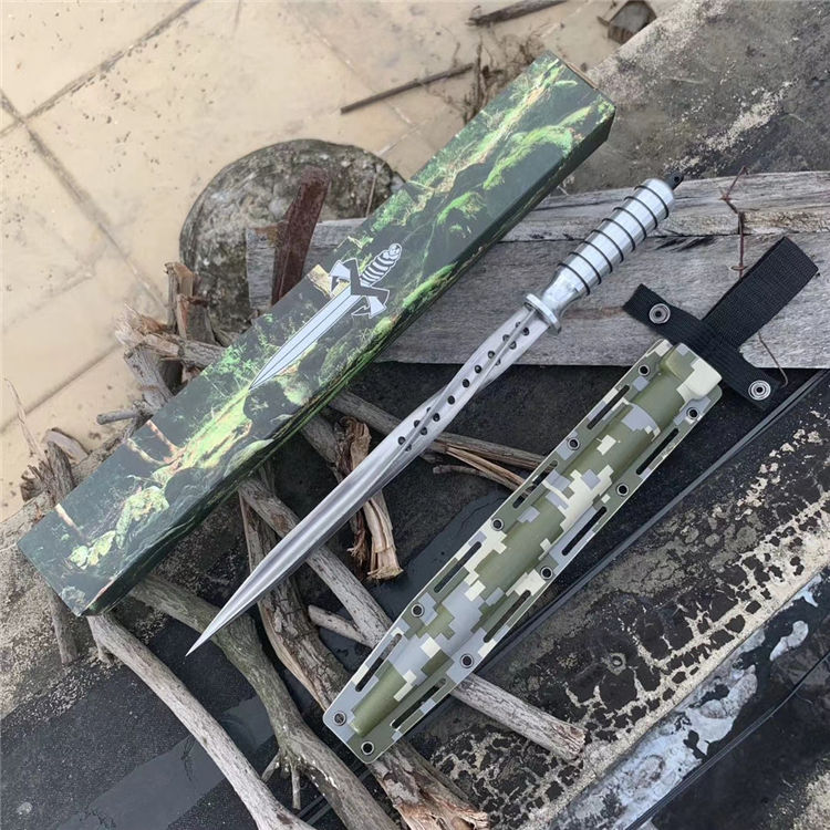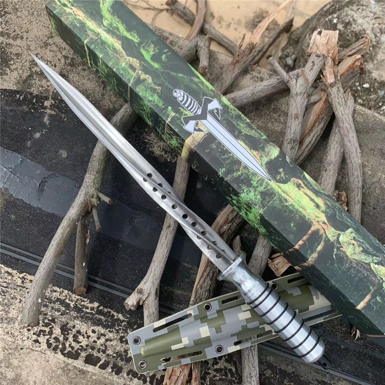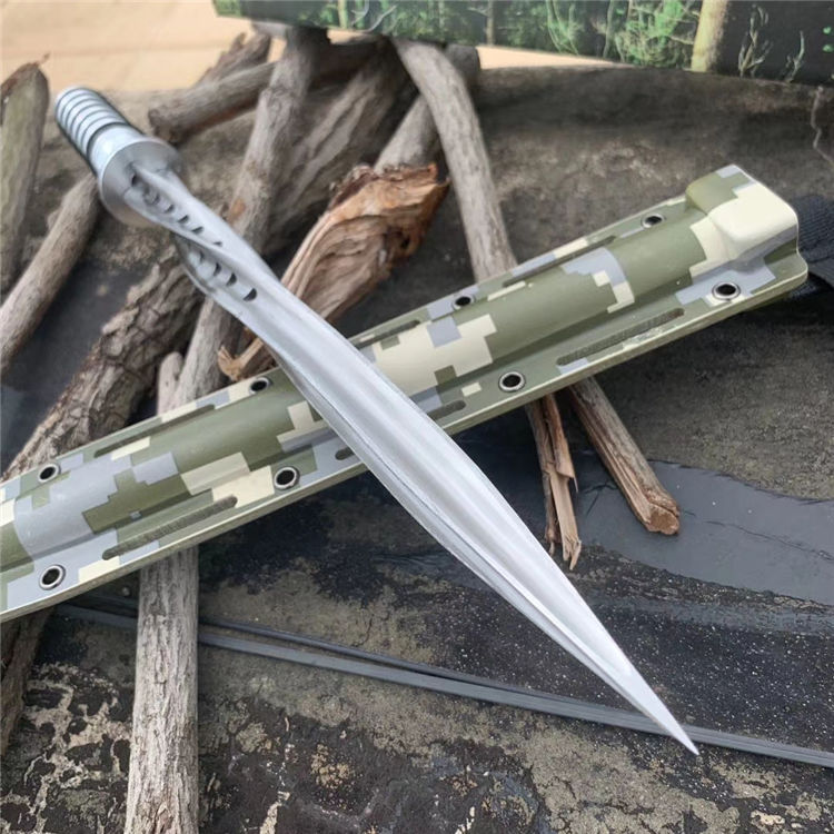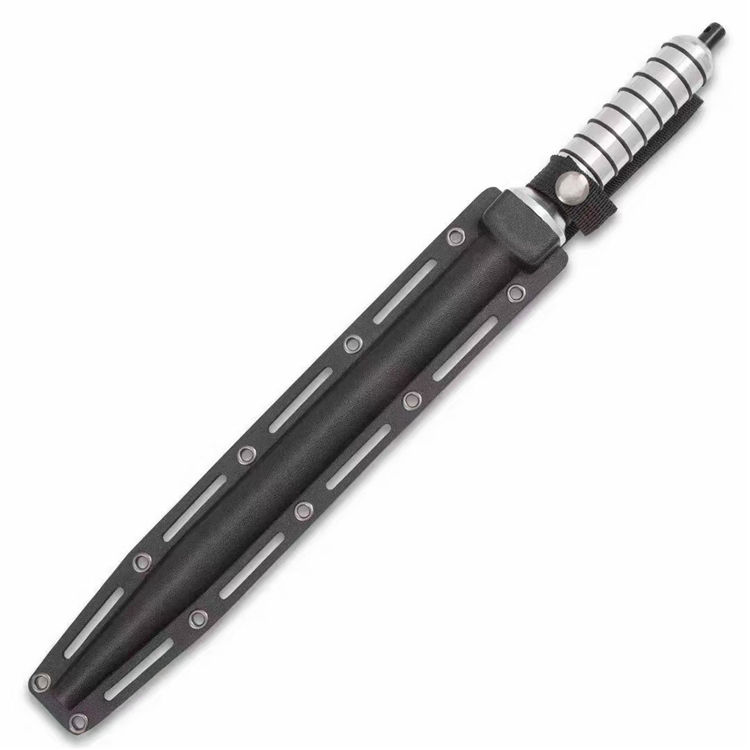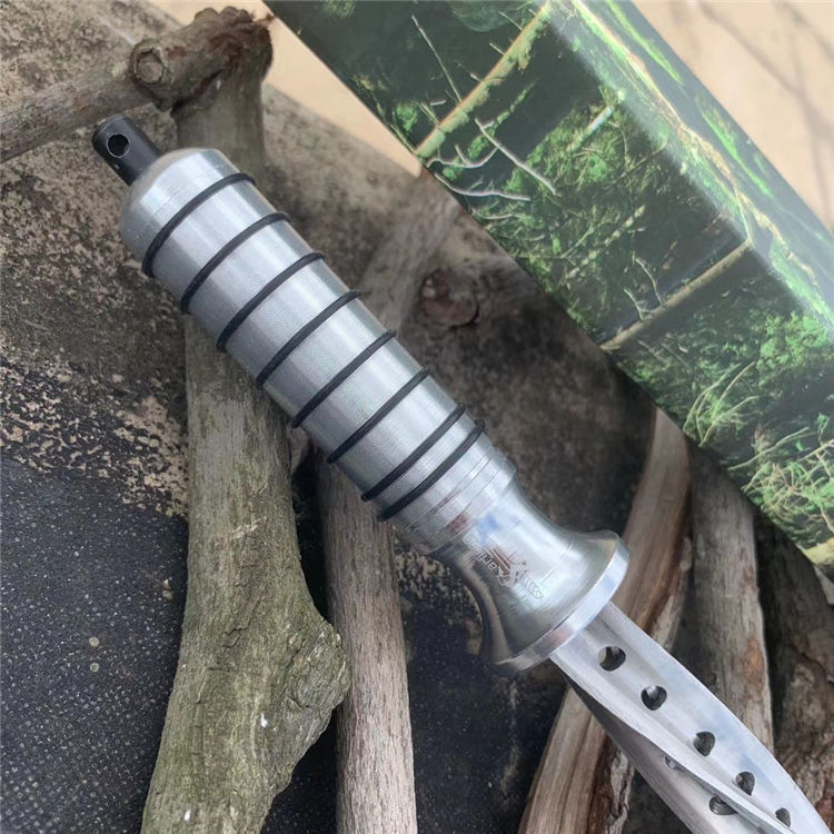 钢铁骑士螺旋军刺 长 度:42.3CM 刃 长:29.7CM 直 径:2.5CM 重 量:471g含包装 硬 度:56HRC 刀 材:5Cr13Mov 柄 材:航空铝 其 他:K鞘 配创可贴 表面处理:砂光