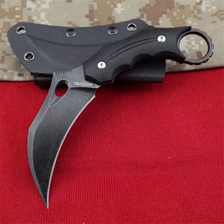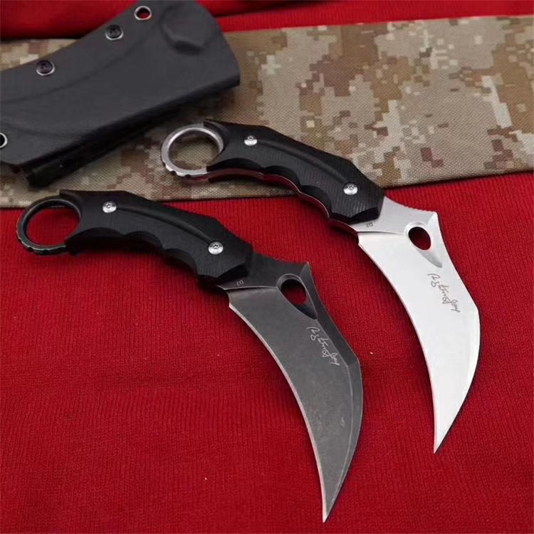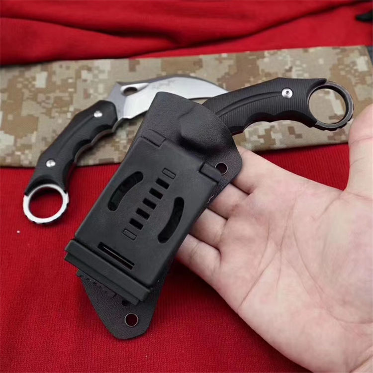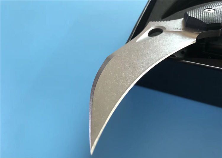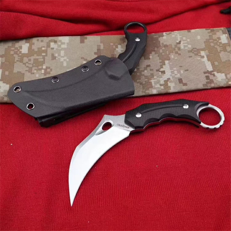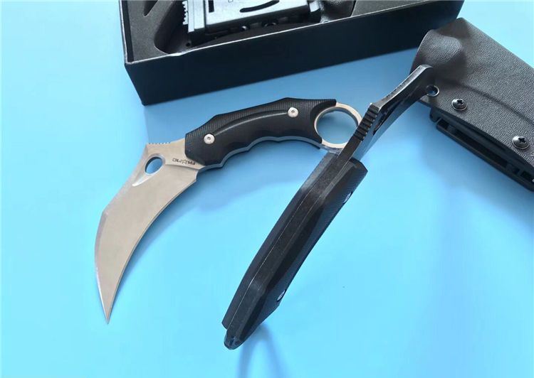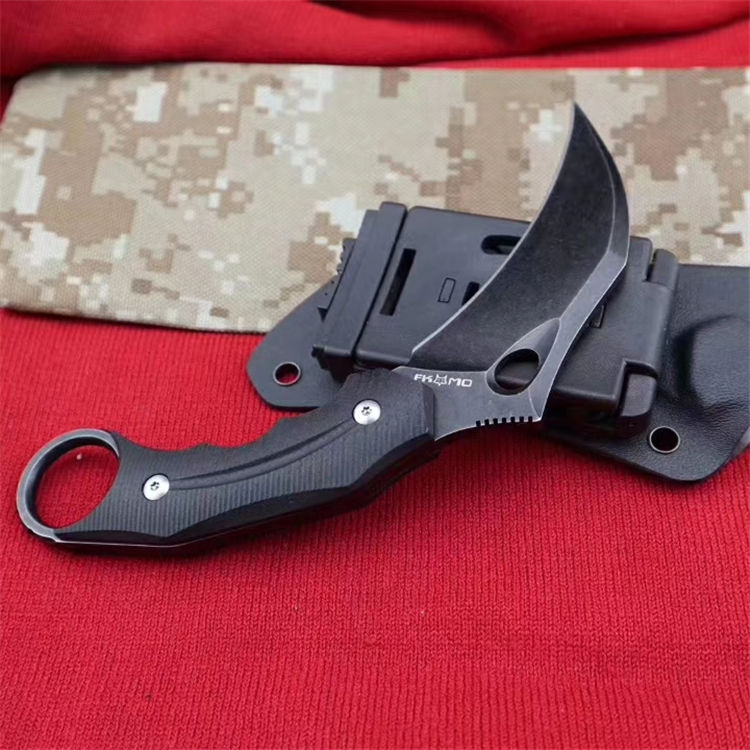狐狸FOX响尾狐爪刀 全 长:18.5cm 刃 长:9cm 柄 长:9.5cm 刃 宽:3.8cm 刃 厚:0.45cm 刃 材:D2钢 重 量:200(单刀) 硬 度:60--61HRC(真空油冷热处理) 表 面:石洗和沧桑石洗 柄 材:黑色G10 其 他:K鞘和礼品盒