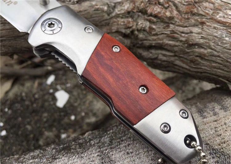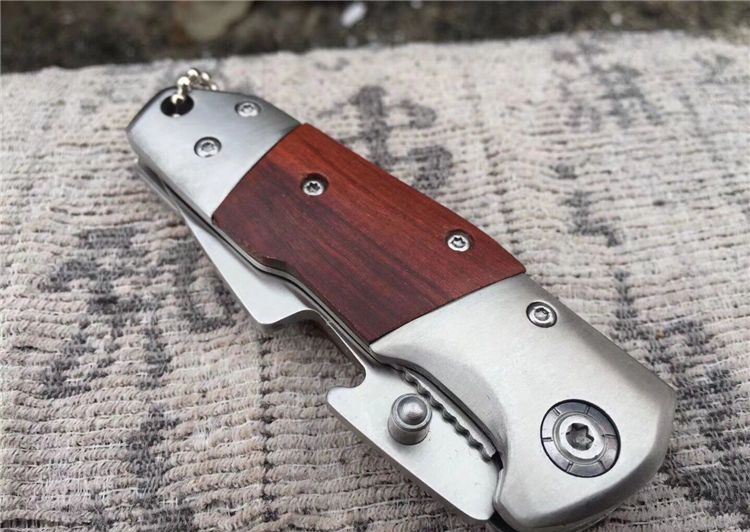 F115折刀 全长:15.3cm 刃长:6.7cm 柄长:8.9cm 刃宽:2.6cm 刃厚:0.29cm 刃材:440 重量:121g(含包装) 硬度:58HRC 表面:沙光 柄材:双钢头+酸枝木 锁型:侧锁 其他:彩盒