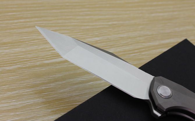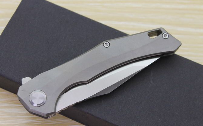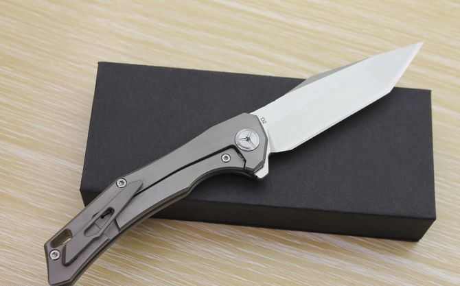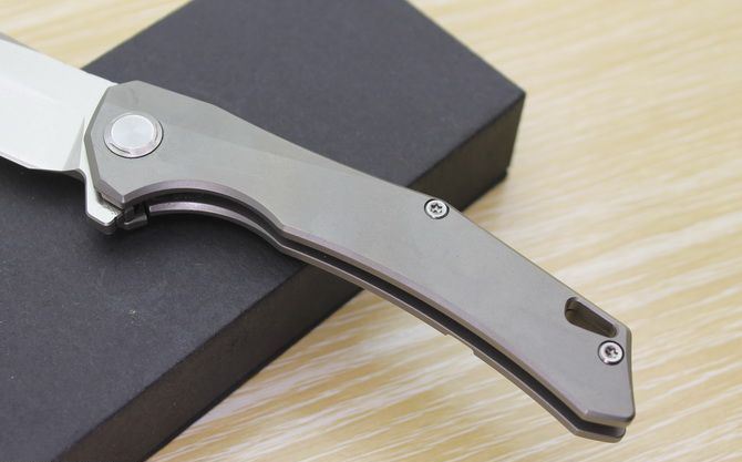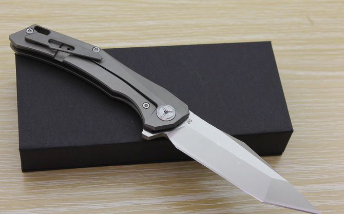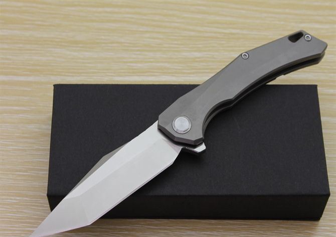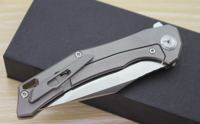 TS43瘦身小子全钛柄方头折刀 全长:21.5cm 刃长:9.5cm 柄长:12cm 刃最宽:2.7cm 刃厚:4mm 刃材:D2钢(精细沙光处理) 刀重:130g 总量:200g(含包装物) 硬度:59-60HRC 表面:手工磨沙 柄材:正反面CT-4钛柄 刀夹:超弹力钛夹 锁型:线锁 螺丝:所有螺丝420不锈钢硬度HRC45,全CNC精雕加工,内置轴承 结构:线锁锋利