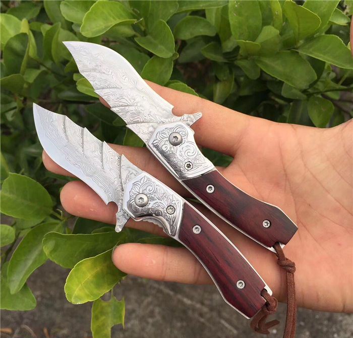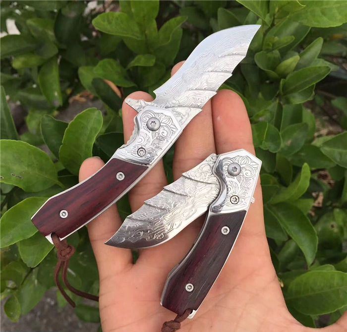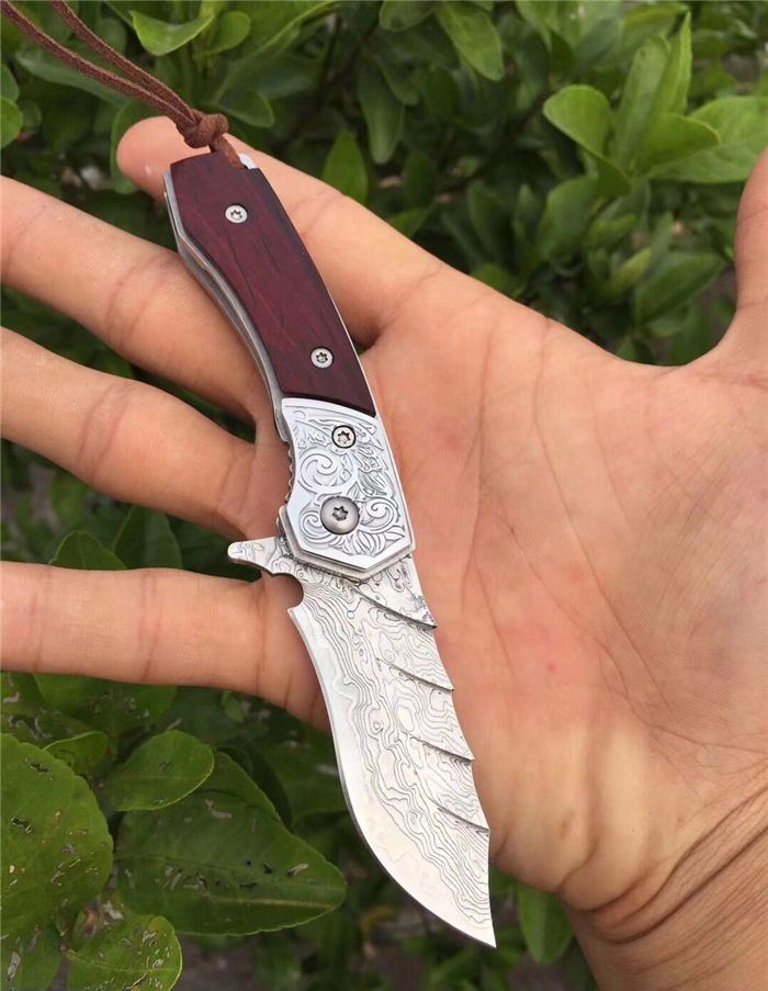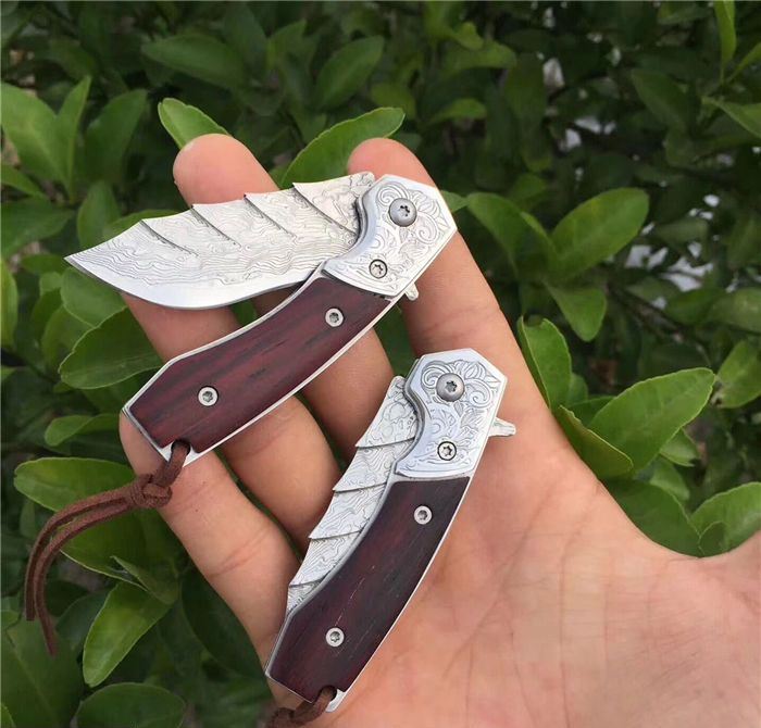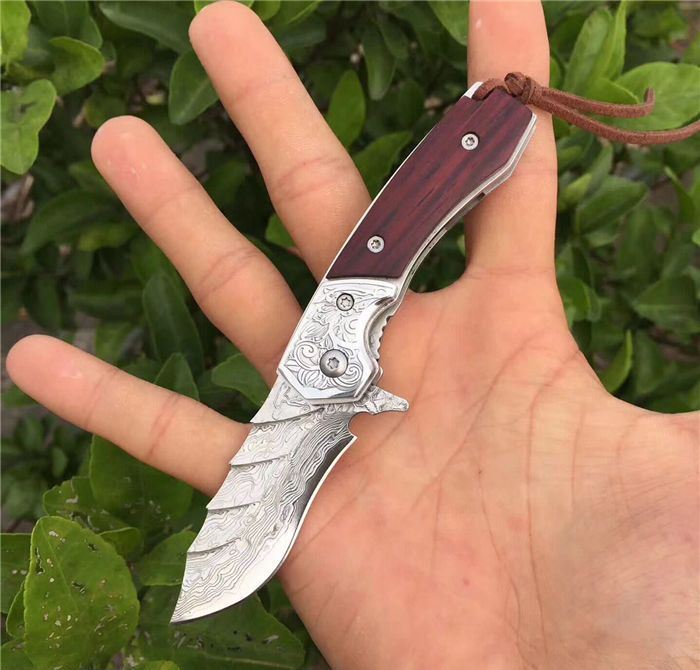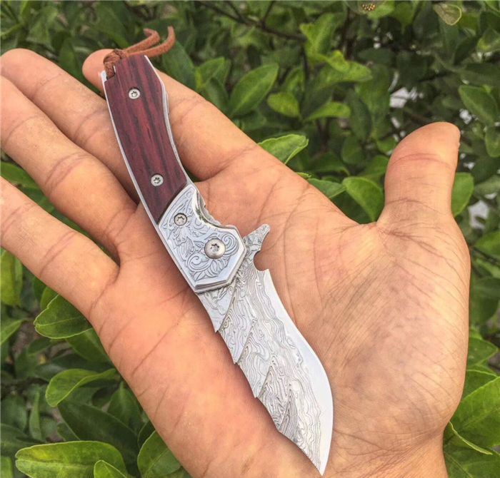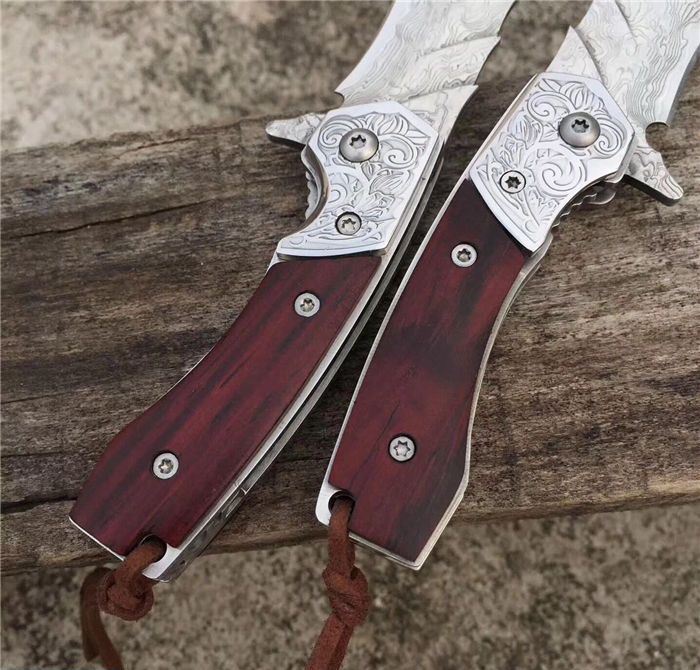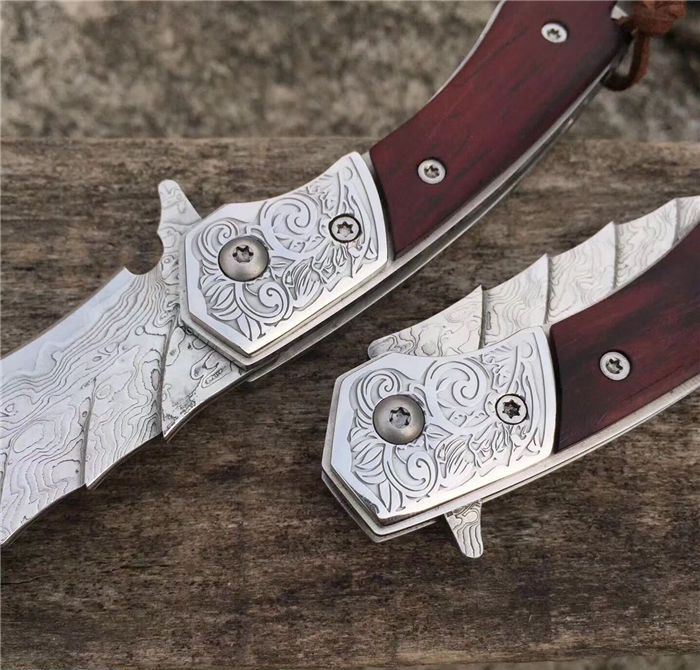 风翼者大马士革钢快开折刀 全长:13.5cm 刃长:5cm 刃厚:2.5mm 硬度:60HRC 刃材:VG10 手柄材料:老料大叶紫檀木
