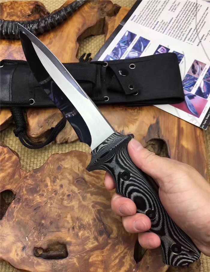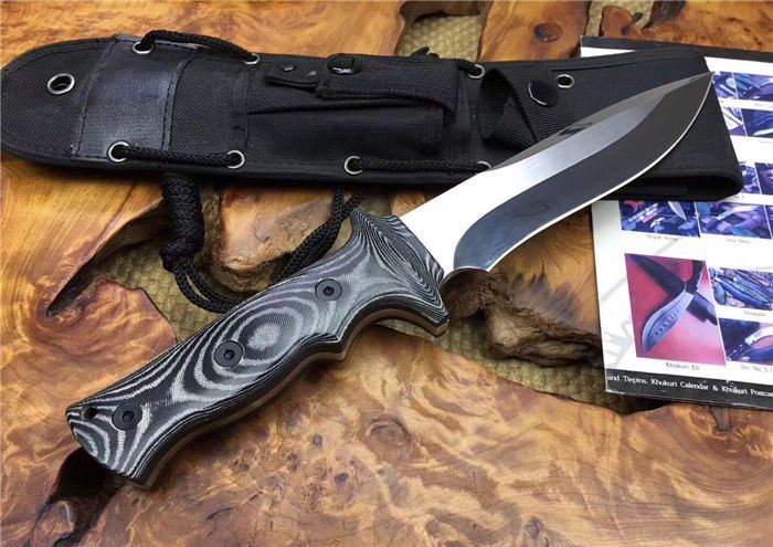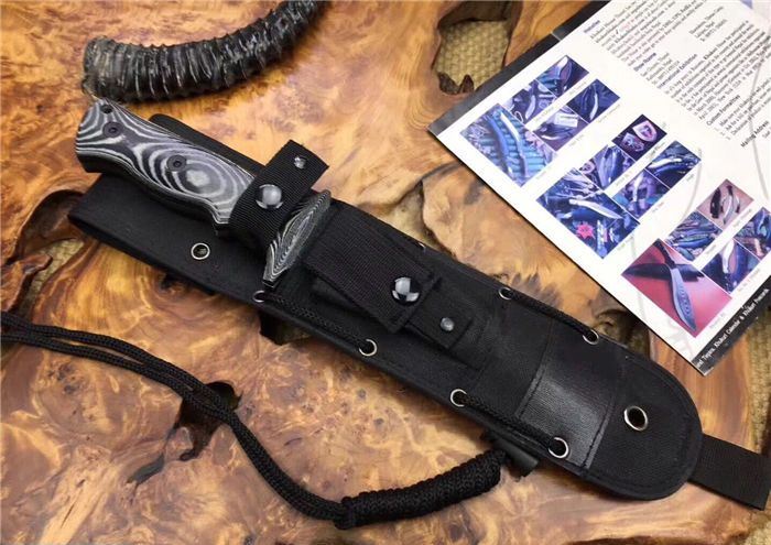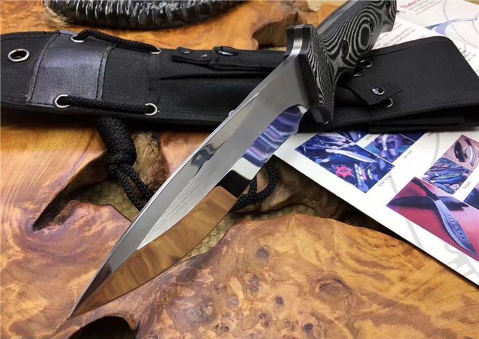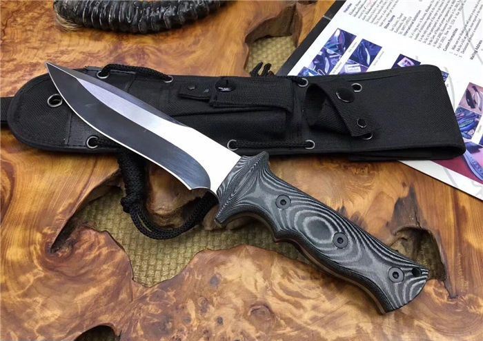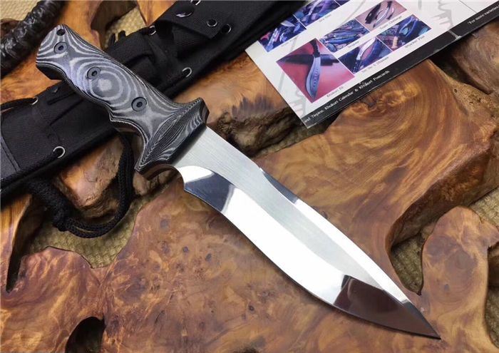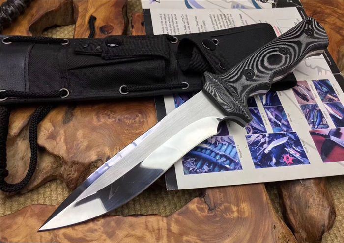 探索者镜光直刀 全长:305mm 刃长:160 mm 柄长:138 mm 刃厚:6 mm 刃材:AUS-10 柄材:米卡塔 硬度:59HRC 重量:630克 表面:拉丝 镜光处理 刀套:高档战术刀套
