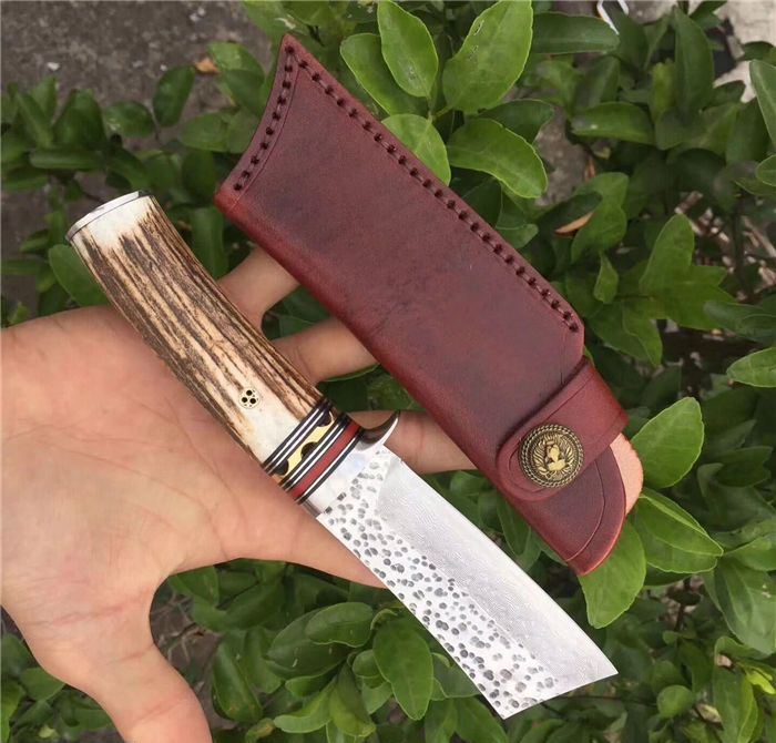 鹿角大马士革小柴刀 全长:21.5cm 刃长:10.5cm 手柄:11cm 刃材:大马士革钢(真空热处理) 硬度:60 刃厚:3.8mm 手柄材料:钢头护手+黄铜+天然鹿角 配合牛皮套