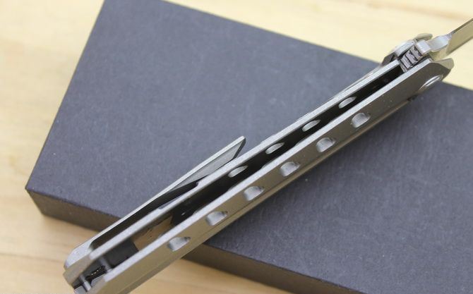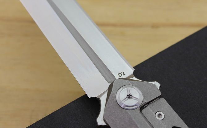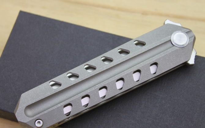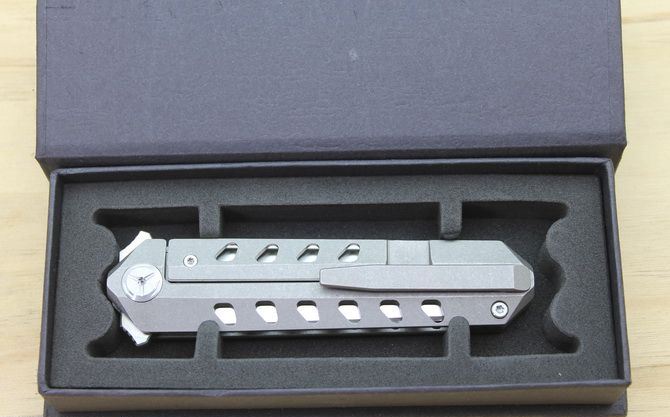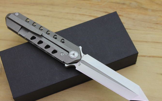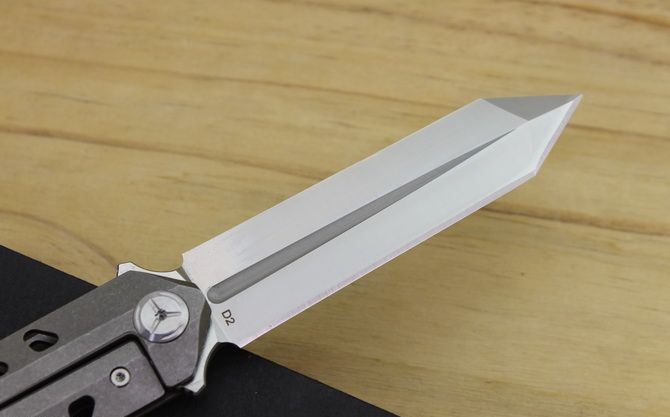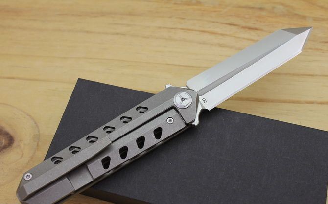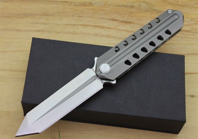 TS52双面D2钢折刀 全 长:21cm 刃 长:9.5cm 柄 长:11.5cm 刃最宽:2.4cm 刃 厚:4mm 刃 材:D2钢 刀 重:130g 总 量:180g (含包装物) 硬 度:59-60HRC 表 面:手工磨沙 柄 材:正反面CT-4 钛柄石洗 刀 夹:超弹力钛夹 锁 型:线锁 螺 丝:所有螺丝420不锈钢硬度HRC45,全CNC精雕加工,内置轴承 结 构:线锁 锋利 其 它:一面是开刃锋利可削纸,另一面是假刃不锋利的请注意