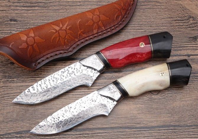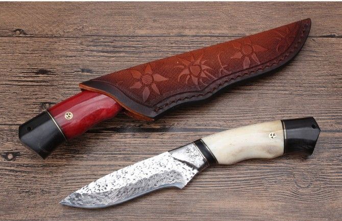进口VG10大马士革钢箭鱼直刀(白骨、红骨) 全长:22.0cm 刃长:10.2cm 刃宽:2.7cm(最宽处) 刃厚:3.5mm 柄长:12.6cm 表面:锻打大马士革花纹 刃材:VG10大马士革钢 硬度:59HRC 柄材:柄材料骆驼骨加牛角加大马士革钢头和手工雕花 重量:304克(含包装) 包装:手工皮套、礼品盒 其他:刃口锋利大马士革钢花纹和把手木纹及颜色各异,以实物为准