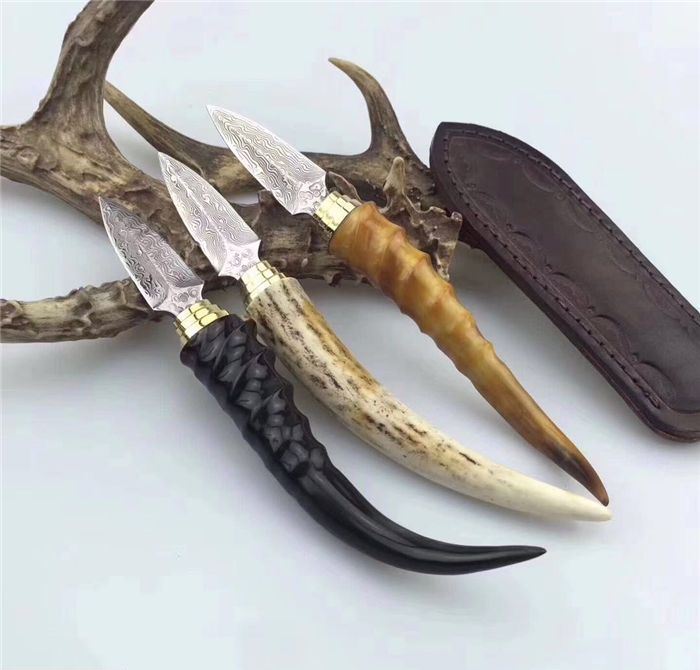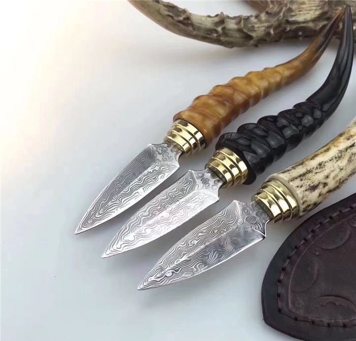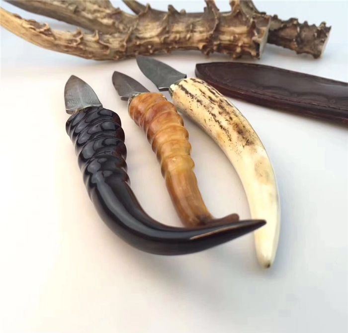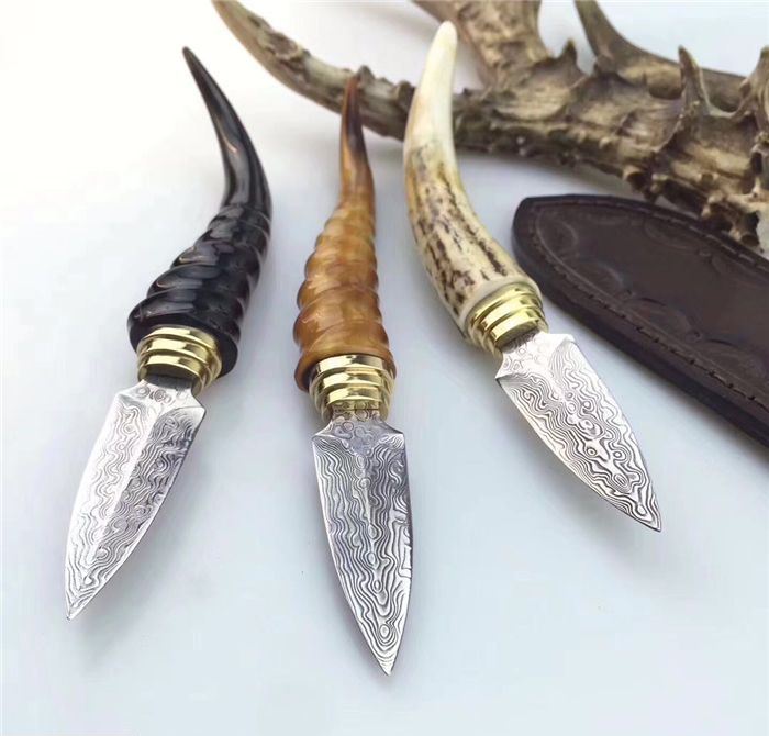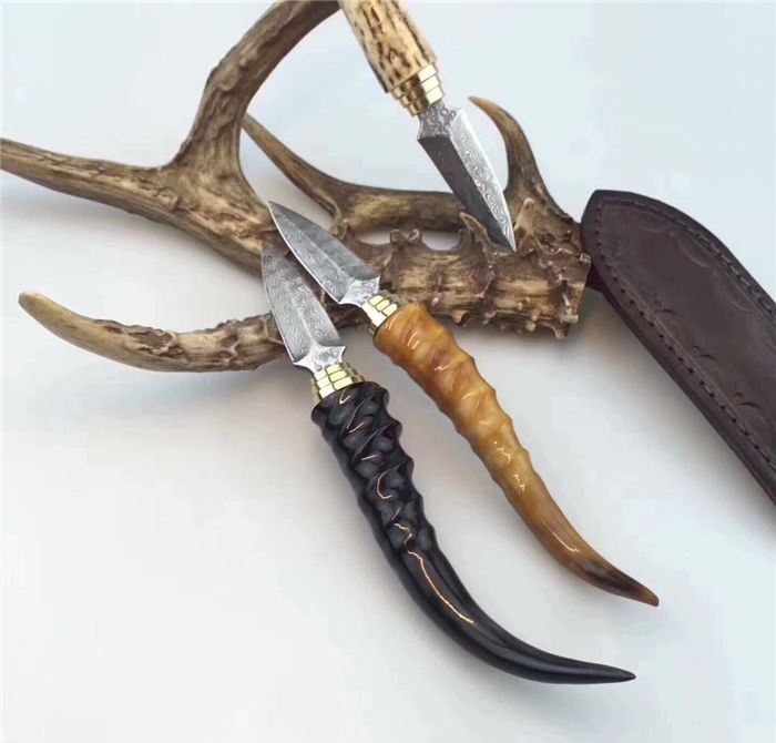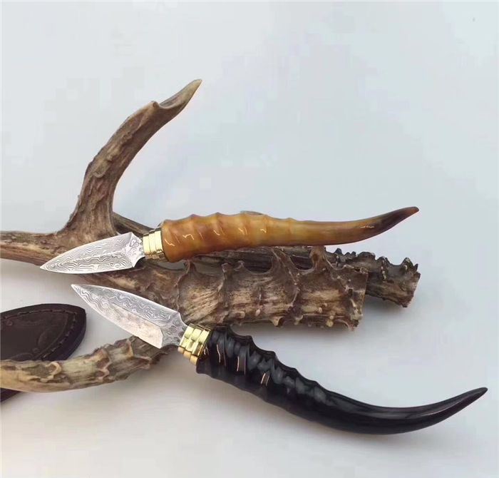 潇-手工羊角茶刀 全长:19cm 茶刃长:5.5cm 钢材厚度:2.7mm 硬度:59HRC 茶刃钢材:锻打大马士革无芯钢、花纹整体突出 手柄材料:黄铜头+(天然羊角)(黄羊角)(鹿角)、配手工牛皮茶套、 礼品盒包装、收藏级! 原生态材料手柄、精挑上等好料子制作、做工细致每一把都是精品.