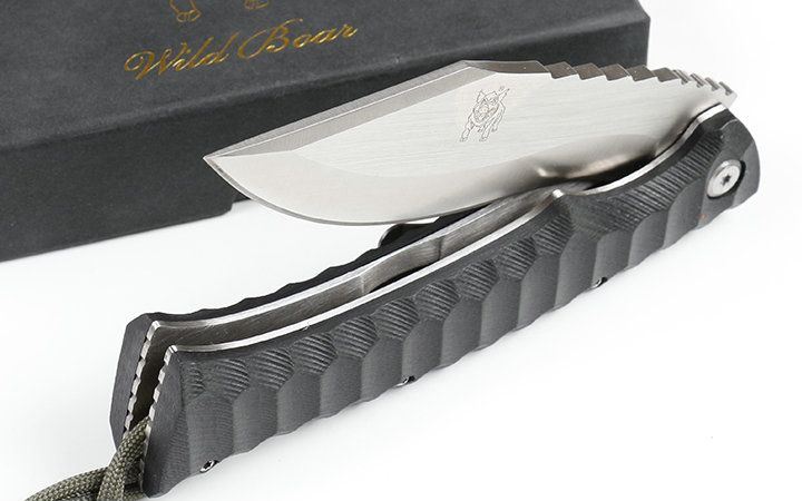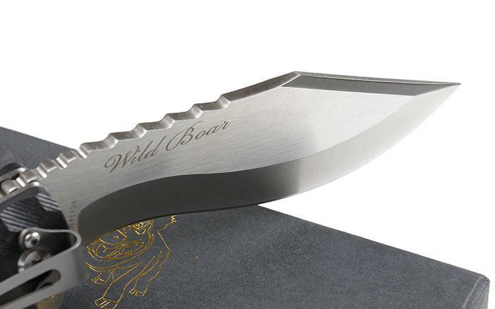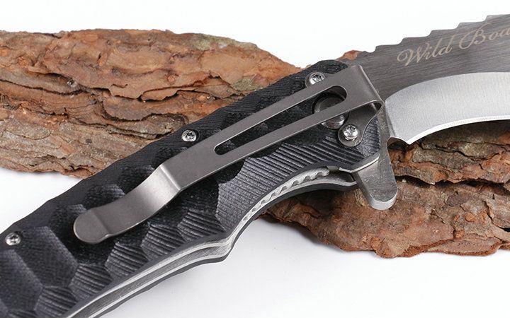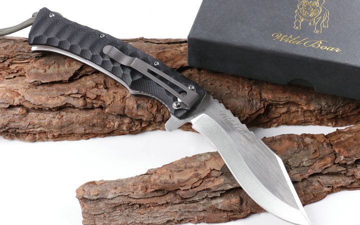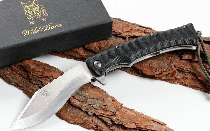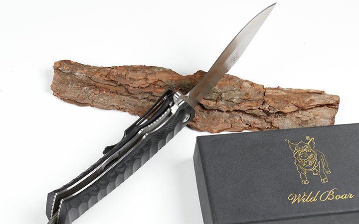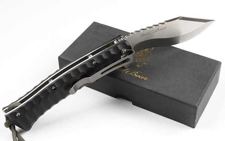 山猪狗腿大折刀 全长:250mm 刃长:113mm 柄长:138mm 刃宽:3.7mm 刃厚:3.8mm 刃材:8cr14mov 重量:281g(含包装) 硬度:57-58HRC 表面:沙光+拉丝 柄材:手柄钢片+黑G10经CNC加工 螺丝:所有的螺丝420不锈钢