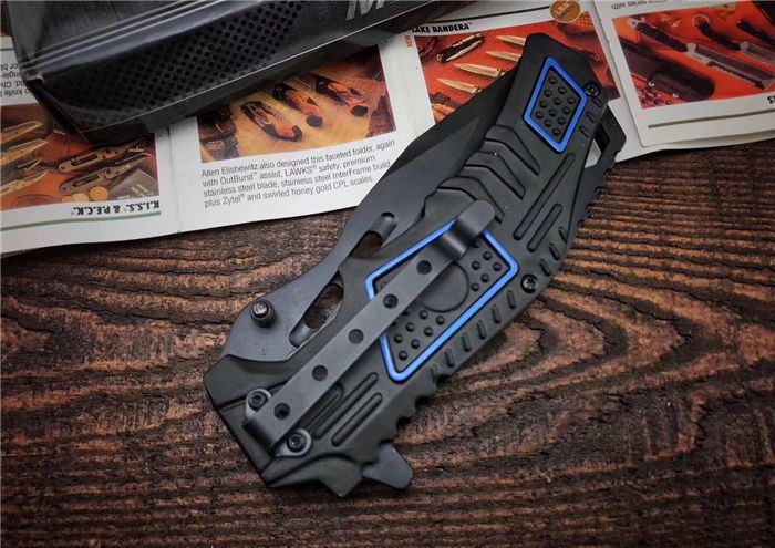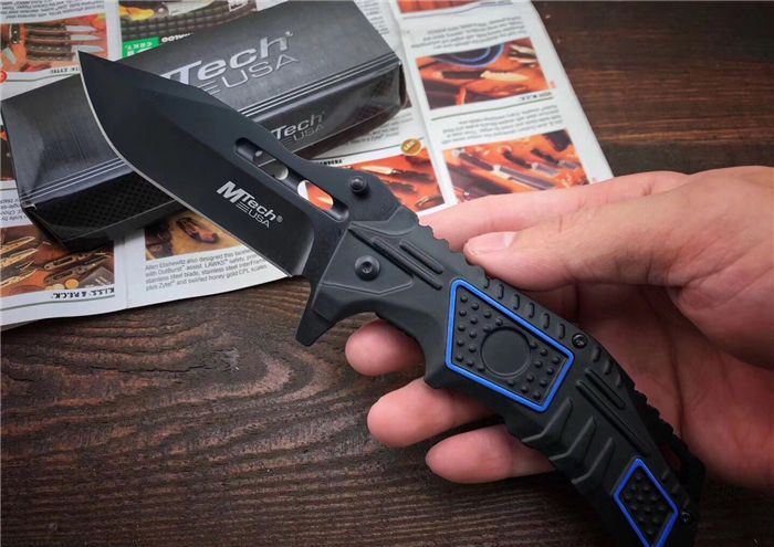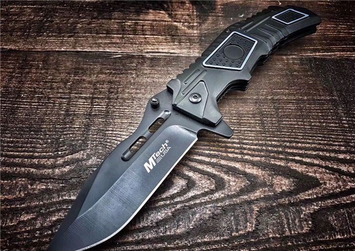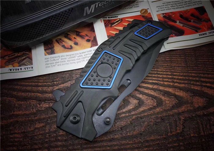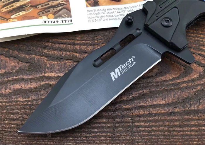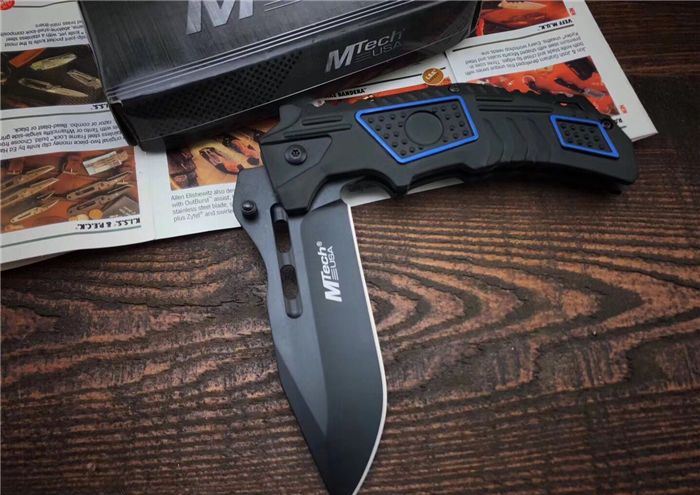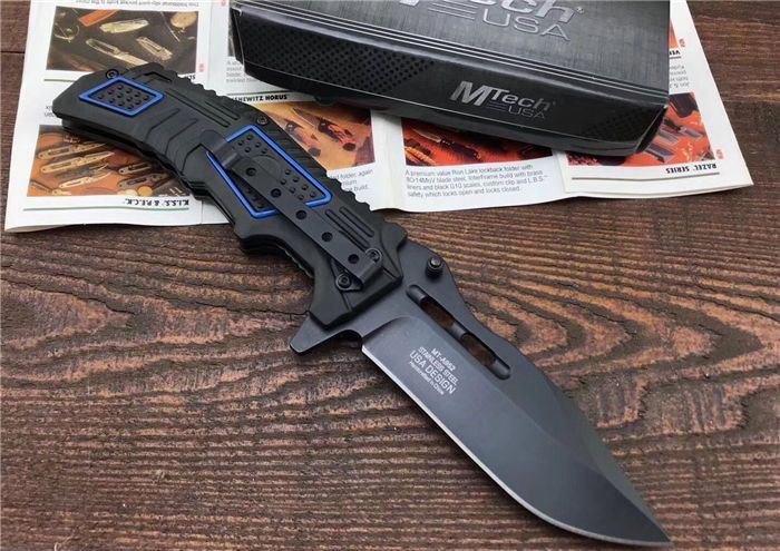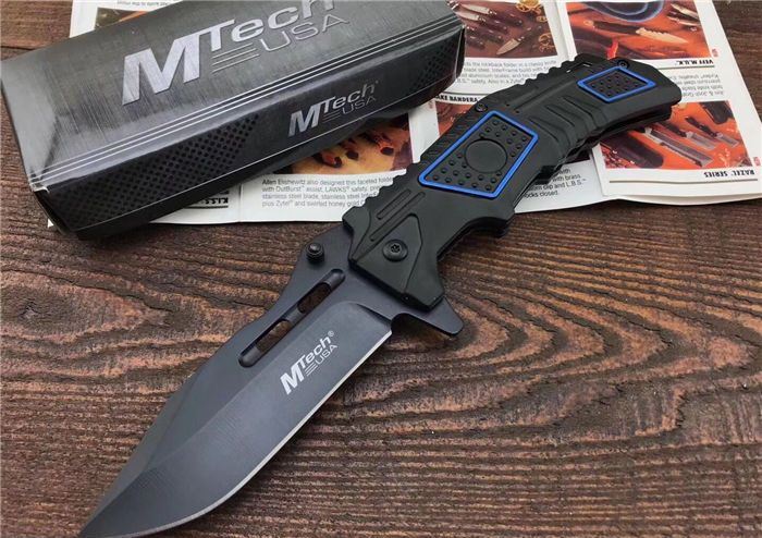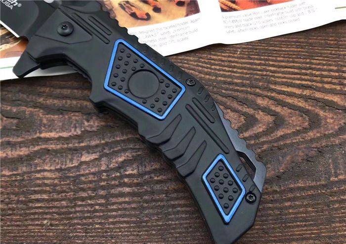 MTech-A952快开折刀 全 长:22.0cm 刃 长:9.5cm 柄 长:11.5cm 刃 宽:3cm(最宽处) 刃 厚:2.9mm 刃 材:5CR13MOV 硬 度:56HRC 刀 柄:钢柄 表 面:石洗+黑钛 重 量:150克 配原厂包装