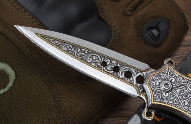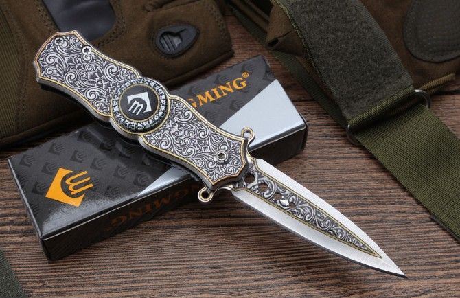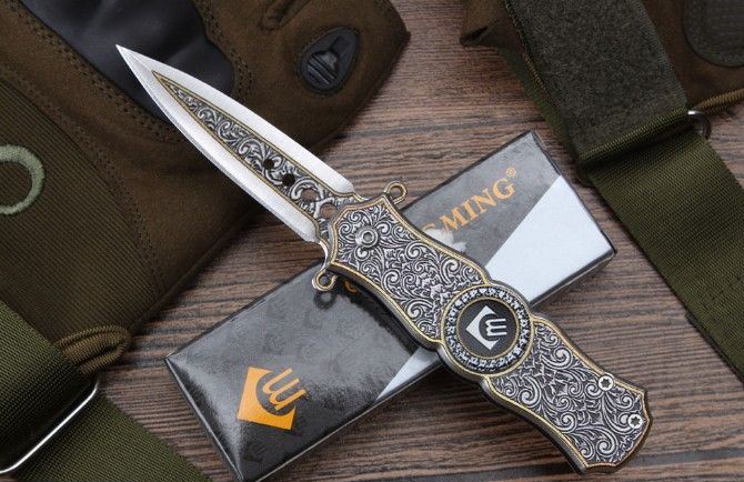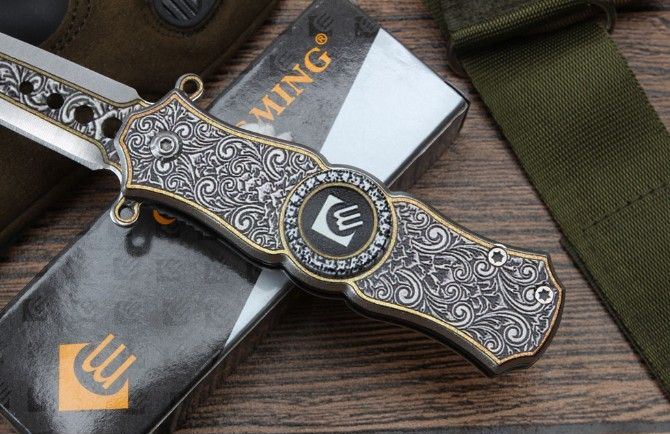 陀螺CM78金色折刀 全 长:15.5cm 刃 长:6.8cm 柄 长:8.7cm 刃 宽:1.8cm 刃 厚:2.5mm 刃 材:440 重 量:86(含包装) 硬 度:57HRC 表 面:三维图案 柄 材:钢片+铝片 锁 型:线锁 其 他:配彩盒,打开刀是折刀,收刀回是陀螺,两体合一,是款不错的折刀。