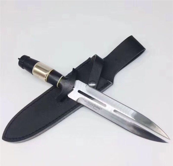 新版敢死队2幽灵双影刀 全长:33CM 刃长:20CM 柄长:13CM 刃材:9Cr18M0V 表面:镜光 硬度:58C 柄材:全钢+纳米镀层+防滑圈 刀鞘:头层牛皮套 重量:净重400g,毛重770g(含礼品盒,牛皮套,防滑圈) 简介:敢死队系列中的全功能刀,刀刃为镜面双锋设计,能满足在格斗中穿刺,削,弯钢线,撞击等多种功能, 全精钢手抦,中间带缓冲隔垫,刀刃及手抦全纳米镀层处理,确保在恶劣环镜下能发挥该刀的最大功能,该刀刀刃锋利,广大敢死队粉丝又一珍藏珍品