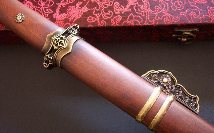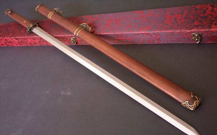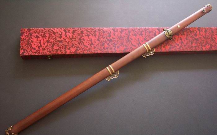 龙泉唐剑(花纹钢) 全长:105 厘米 柄长:28 厘米 剑宽:3.2 厘米 厚度:0.9厘米 材质:花纹钢 工艺:古法淬火,回火,等热处理.全手工锻造,四面手工精细研磨,开刃. 硬度:58HRC 装配:纯铜剑装,檀木 剑重:1460克(含鞘) 整套:2200克(含锦盒)